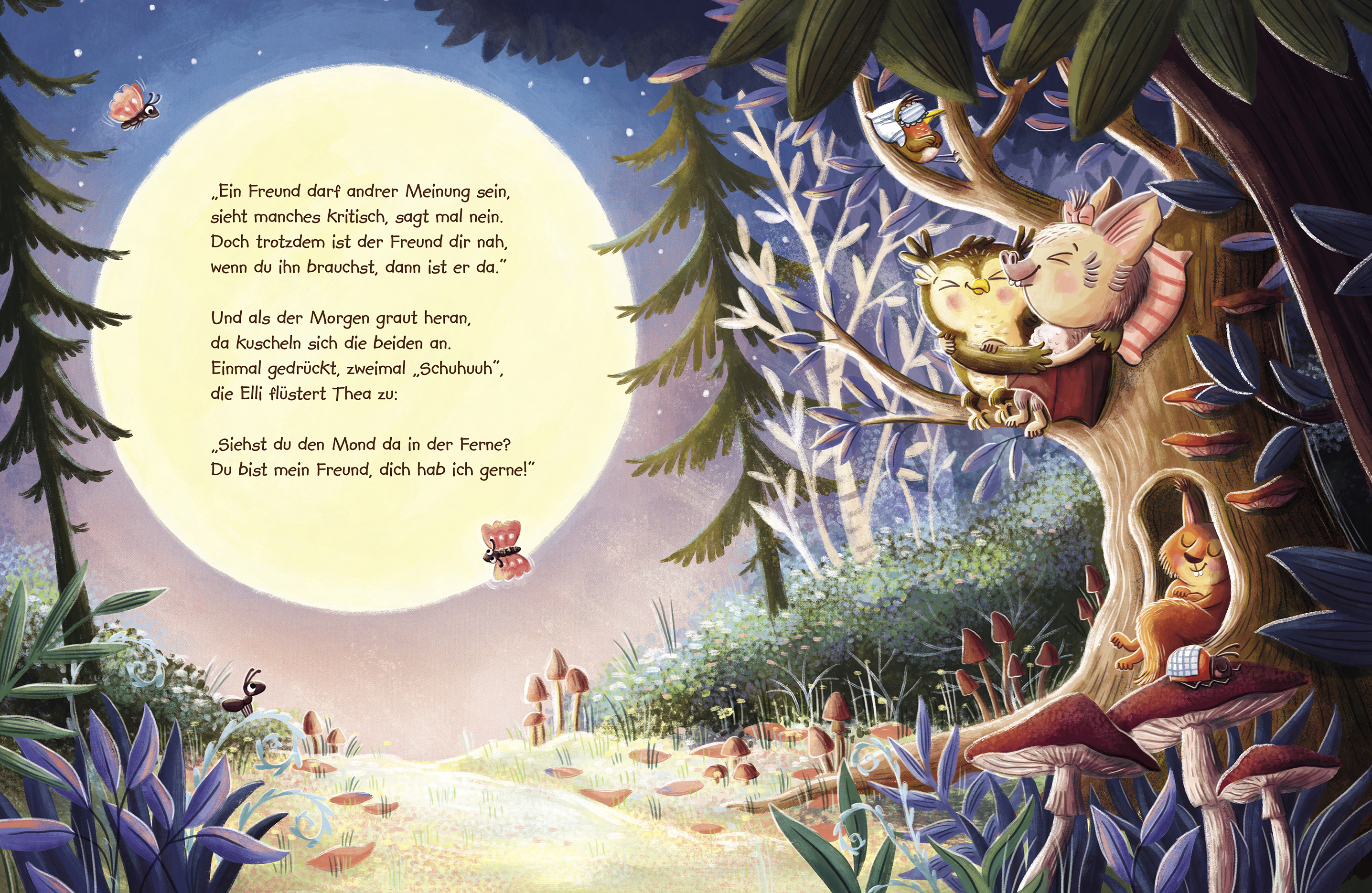 Eigentlich sind Eule Elli und Thea Fledermaus ein Herz und eine Seele. Doch als sie darüber in Streit geraten, ob der Mond nun von oben oder von unten scheint, da hört bei beiden die Freundschaft auf. Aber vielleicht wissen ja die anderen Tiere einen Rat … Eine kluge Geschichte, die auf sehr humorvolle und kindgerechte Weise vermittelt, worauf es in einer Freundschaft ankommt: Dass es niemals nur die „eine“ Wahrheit gibt, dass man Dinge immer aus mehreren Perspektiven betrachten kann und dass man lernen muss, Gelerntes zu reflektieren.