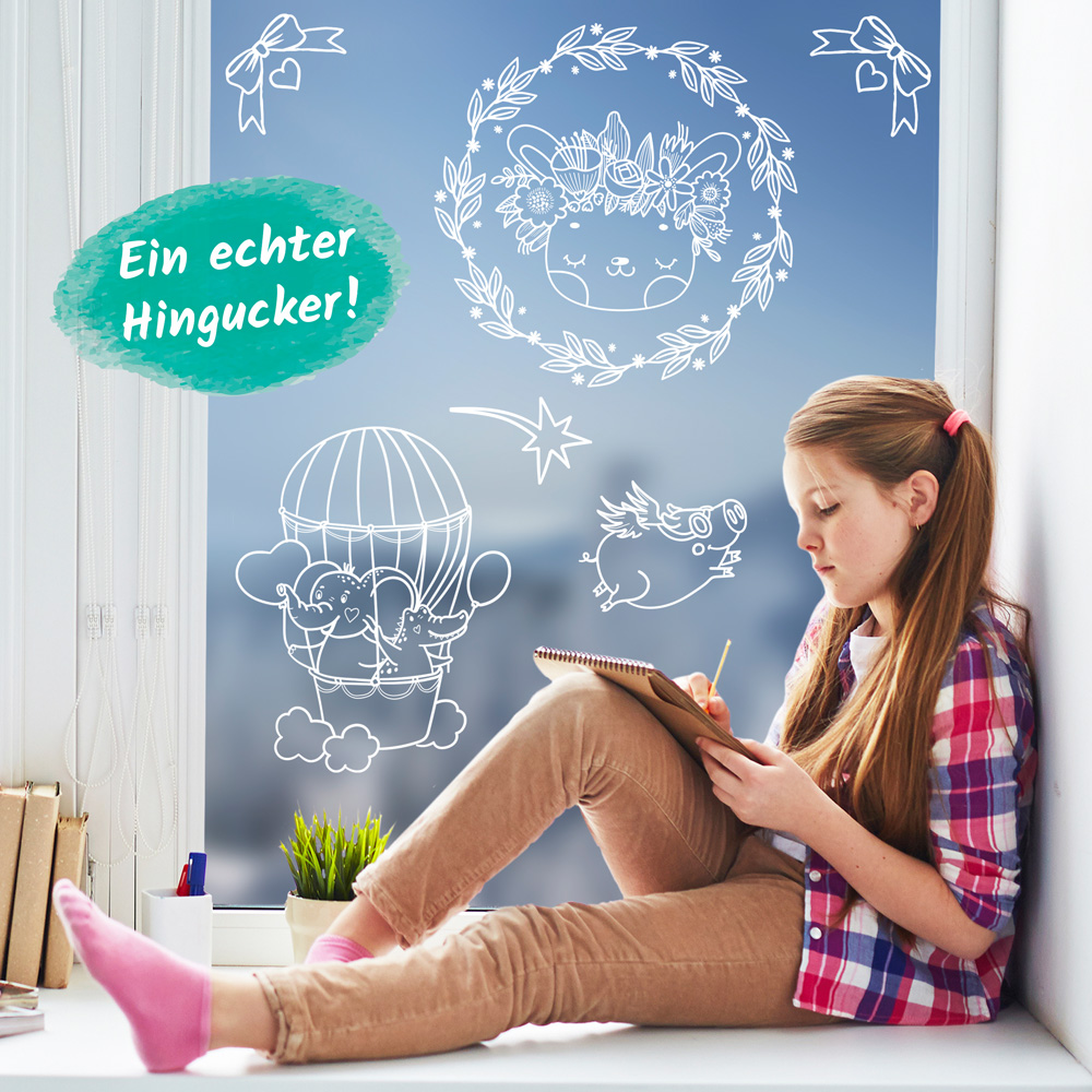 Wunderschöne Fensterdeko zum Selbstgestalten! Mit dem weißen Kreidemarker lassen sich kinderleicht lustige Tiere auf Fensterscheiben und glatte Glasflächen zaubern. Damit werden die Kinderzimmerfenster garantiert zum Hingucker. Natürlich lässt sich die Farbe rückstandslos entfernen. Die 10 Vorlagen sind kreativ, individuell und immer wieder neu kombinierbar!