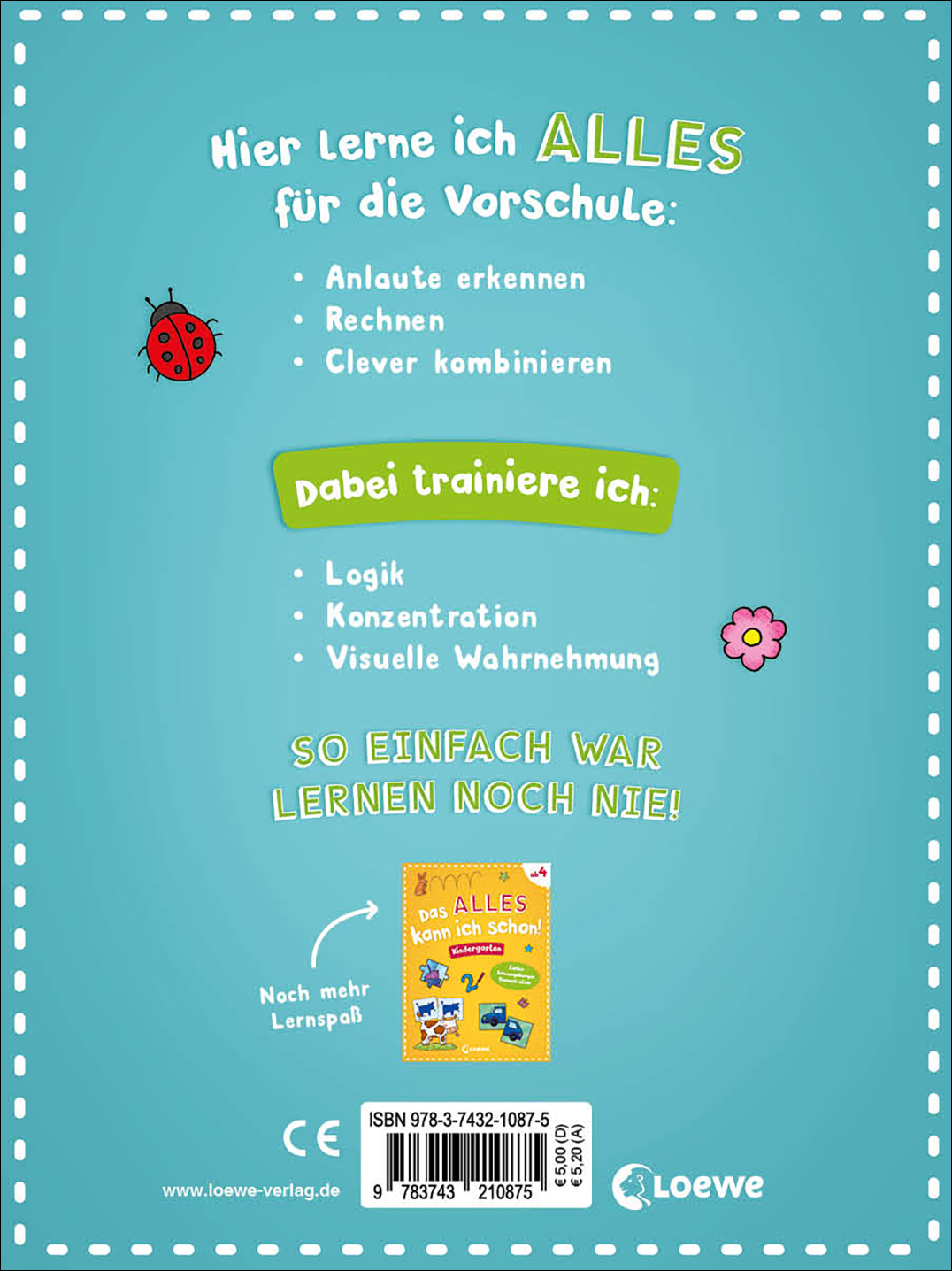 „Ich kann schon zählen, rechnen, schreiben, logisch denken und kombinieren!“ Das alles kann ich schon! vereint wichtige Lernthemen im Kindergarten und in der Vorschule. Schwungübungen folgen auf Zahlenrätsel und erste Rechenspiele, Logikaufgaben ergänzen Übungen zu den Anlauten. In den dicken Blocks im handlichen Format finden Kinder ab 4 und 5 Jahren alles, was sie für den Kindergarten und die Vorschule brauchen. Mit den abwechslungsreichen Rätseln steigern sie ihr Auffassungsvermögen und trainieren Konzentration und Motorik. Die farbenfrohen und altersgerechten Illustrationen tun dabei ihr Übriges. So einfach war Lernen noch nie!