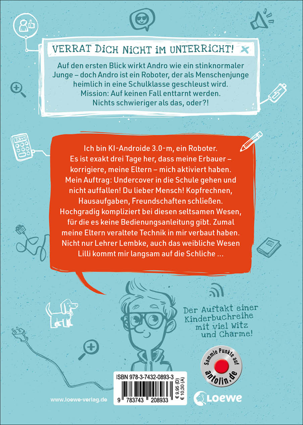 Ich bin KI-Androide 3.0-m. Es ist exakt drei Tage her, dass meine Erbauer – korrigiere, meine Eltern – mich aktiviert haben. Mein Auftrag: Undercover in die Schule gehen und nicht auffallen! Kopfrechnen, Hausaufgaben, Freundschaften schließen. Hochgradig kompliziert bei diesen seltsamen Wesen, für die es keine Bedienungsanleitung gibt. Zumal meine Eltern veraltete Technik in mir verbaut haben. Nicht nur Lehrer Lembke, auch das weibliche Wesen Lilli kommt mir langsam auf die Schliche …
