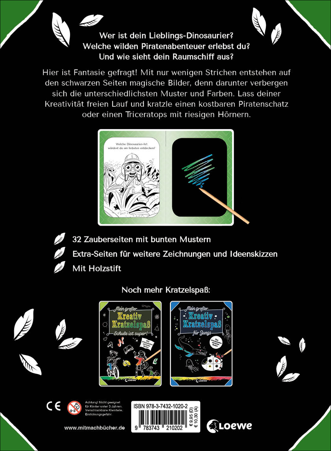+ 32 Zauberseiten mit bunten Mustern + Kratzelbuch + Fördert die Fantasie Ihres Kindes + Beliebte Themen: Weltraum, Dinosaurier, Piraten + Ab 5 Jahren + Mit Holzstift + Mit Extra-Seiten für Zeichnungen und Skizzen +