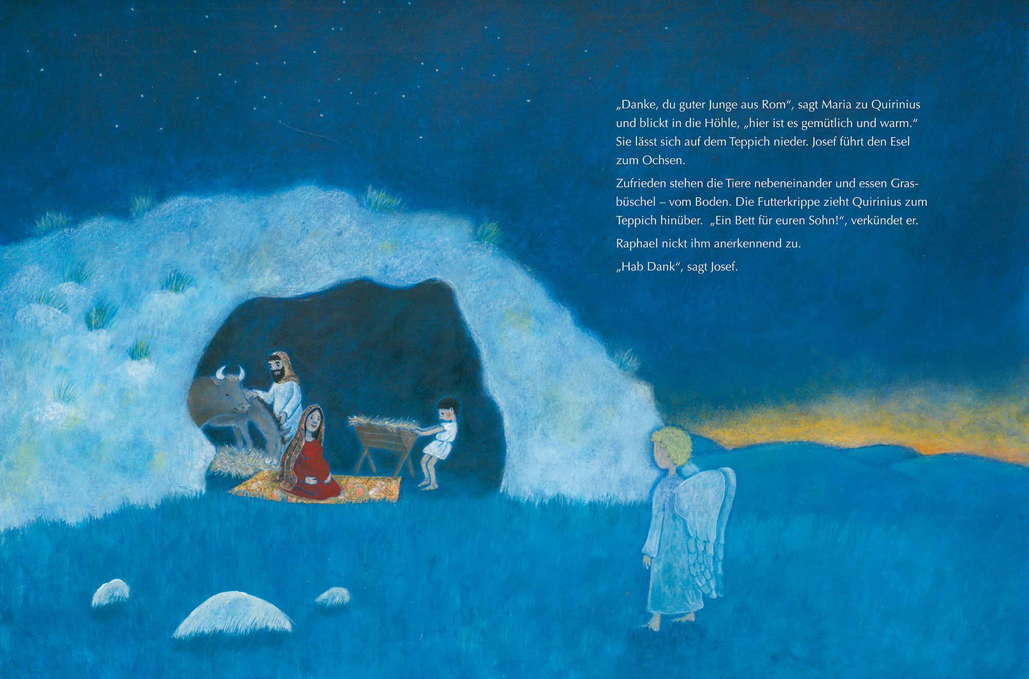 Quirinius, ein kleiner Junge aus Rom, zieht mit seinen Eltern nach Bethlehem. Sein Vater muss für Kaiser Augustus alle Menschen zählen. Als der Junge die neue Gegend erkundet, entdeckt er eine Höhle, in der ein Ochse untergestellt ist. Der Junge ist gerne hier, er bringt einen alten Teppich mit und spielt darauf mit seinen Holzfiguren. Eines Tages steht der kleine Engel Raphael in der Höhle. Bald wird ein neuer König auf die Welt kommen und Raphael sucht dafür einen geeigneten richtigen Platz. Wenn er seine Sache gut macht, bekommt er endlich große Flügel! Vielleicht ist Qurinius' gemütliche Höhle genau der richtige Ort, an dem der neue König geboren werden kann?