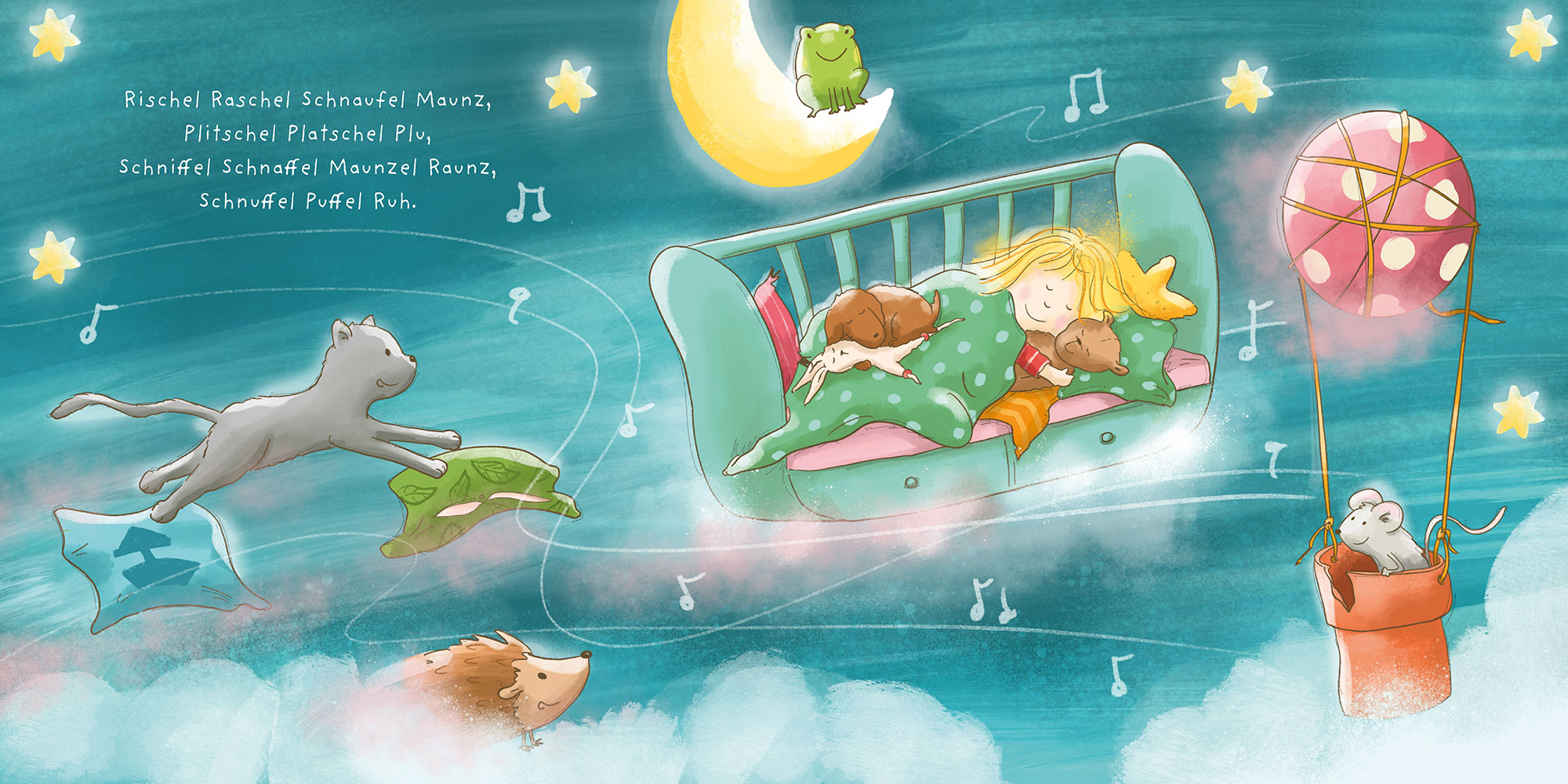 Frosch, Igel, Katze und Maus rascheln, maunzen und schnaufen durch den Garten. Die Geräusche begleiten die kleine Mia in den Schlaf.