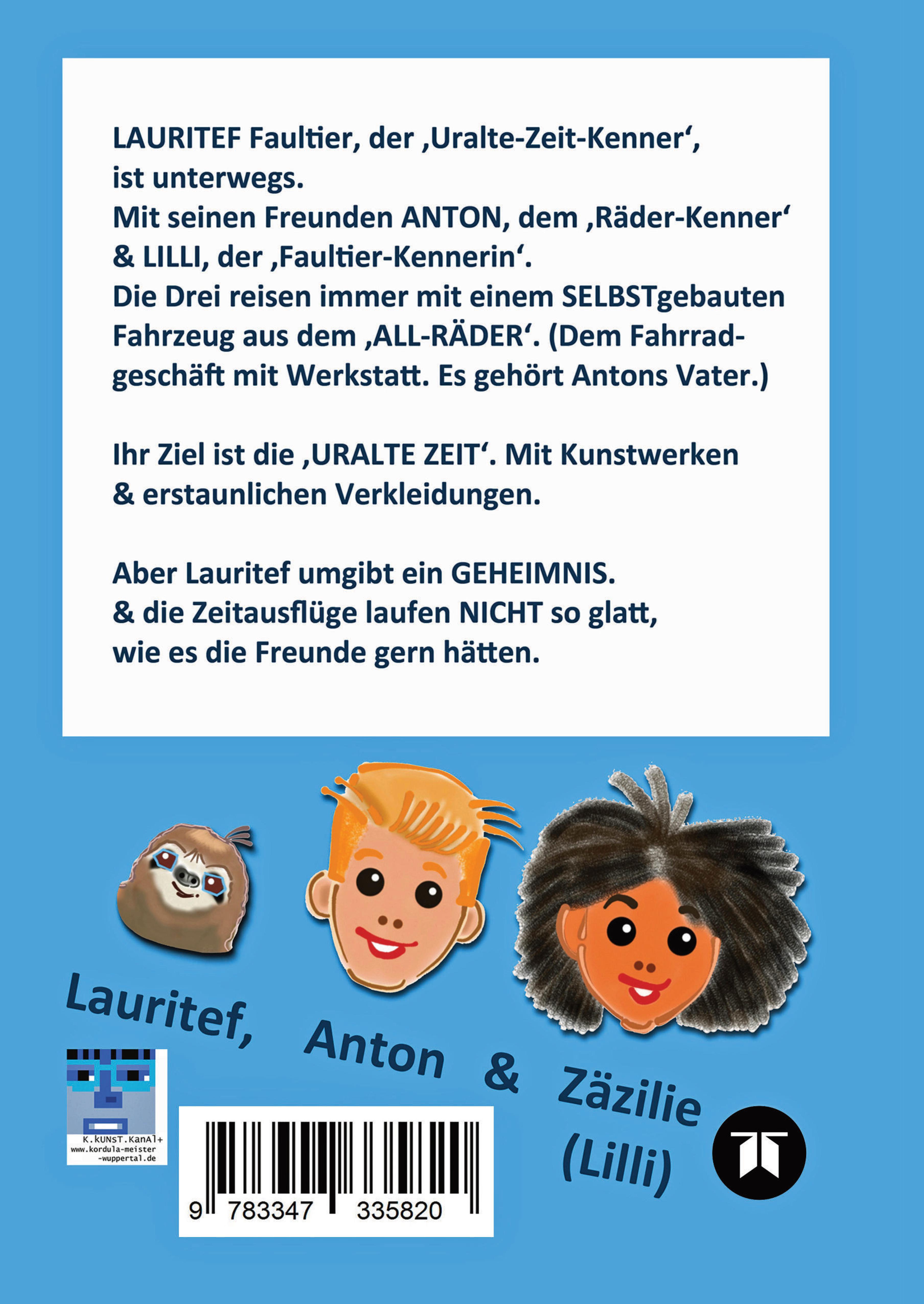 Faultier 'Lauritef' hat ein großes Geheimnis, das nur seine Freunde Lilli und Anton kennen. Genau deshalb wohnt er bei Anton im Fahrradgeschäft 'All-Räder'. Anton ist verrückt auf alles, was Räder hat. Lilli ist die 'Faultier-Kennerin'. Vor ihrem 'Faultier-Wissen ist keiner sicher.Weil Lauritef sooo langweilig ist, bauen die drei Freunde das Fahrrad von Leonardo da Vinvi nach. Auf der Probefahrt mit dem Gefährt geraten die Drei in die 'uralte Zeit' Leonardos (1497).EIN Zeitausflug macht Lust auf mehr. Faultier und Kinder forschen nach: wann wurden Fahrzeuge mit zwei oder vier Rädern erfunden und von wem? Kann man sie nachbauen? Bringt eine neue Probefahrt die Freunde noch einmal in die 'uralte Zeit'? Treffen sie wieder auf ein neues Kunstwerk? Und funktioniert der 'Zeitausflugsmechanismus' auch wirklich reibungslos?