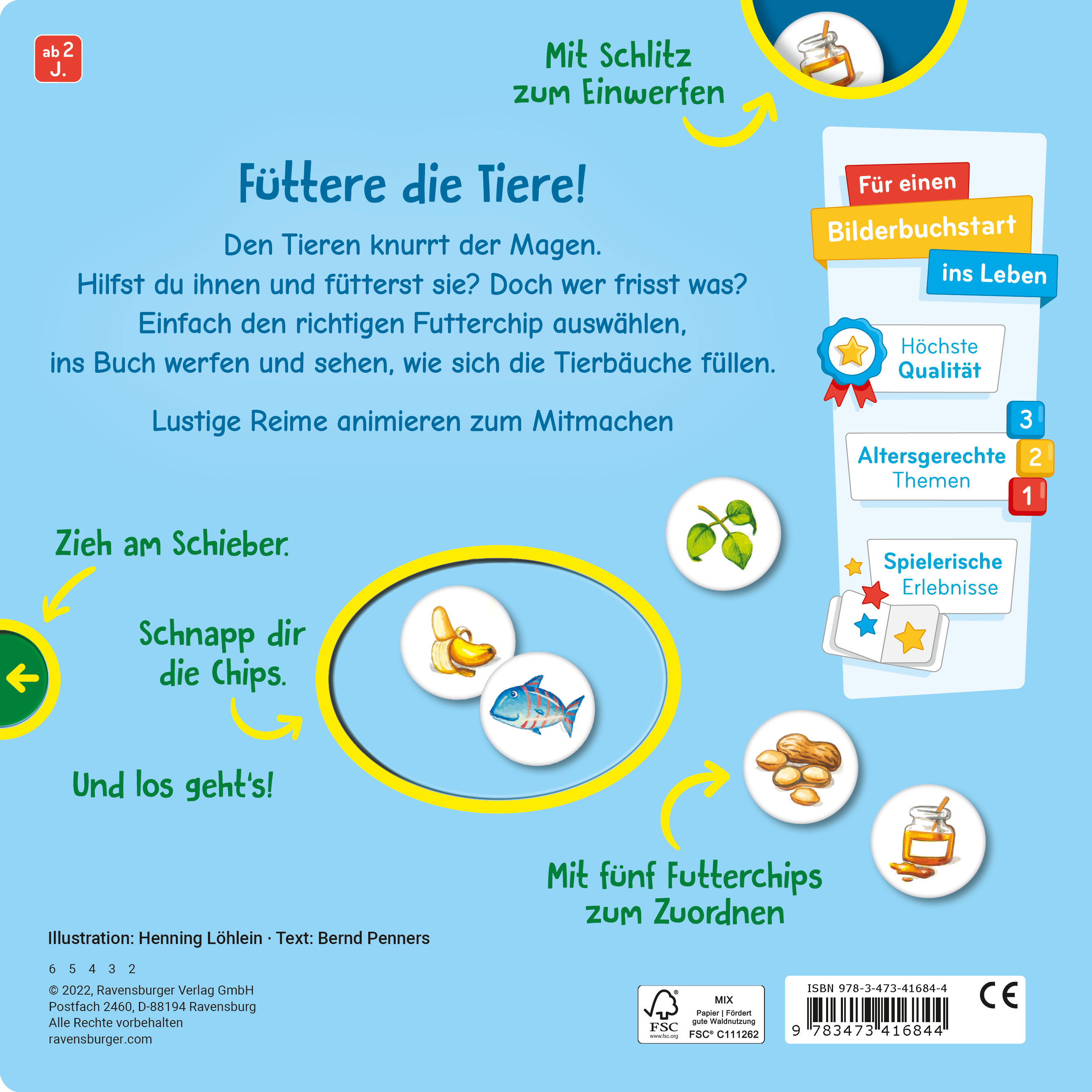 Das Buch kann durch einen Schieber geöffnet und die Spielchips erneut entnommen werden. Das sorgt für unendlichen Spielspaß und die Tiere fragen immer wieder: Wer füttert mich?