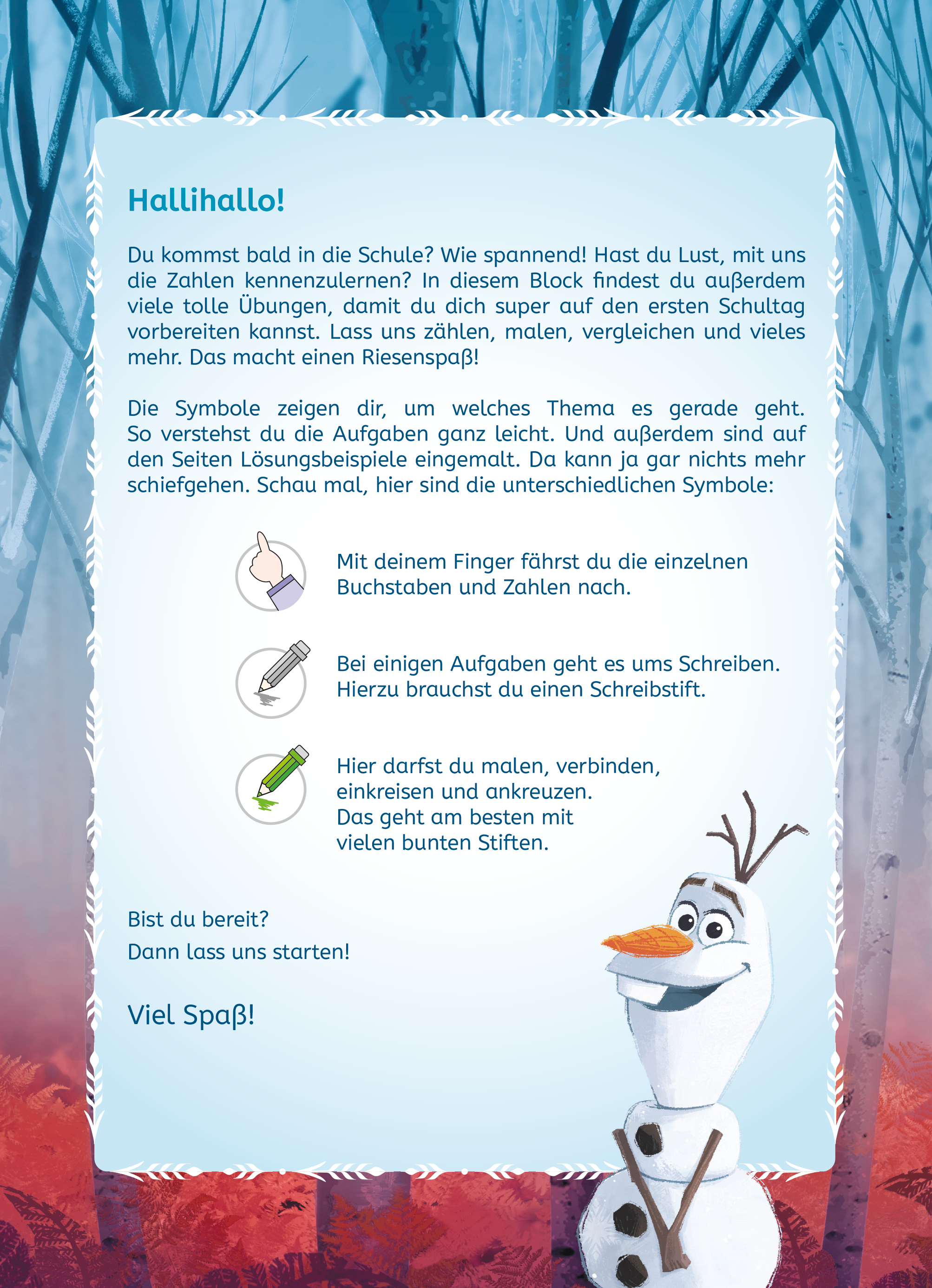 Fit für die Schule mit Elsa, Anna, Olaf und Co.! Mit diesem Vorschulblock lernen Kinder ab 5 Jahren spielerisch erstes Zählen und Rechnen. Durch Förderung der Konzentration und Motorik ist der Block die ideale Vorbereitung für den Schulanfang. Die jungen Frozen-Fans erwarten spannende Aufgaben und wunderschönen Ausmalbilder aus der magischen Welt der Eiskönigin. 128 Seiten Lernspaß mit durchgehend farbigen Illustrationen aus Disneys Die Eiskönigin 2 - so frostig-cool kann Lernen sein!