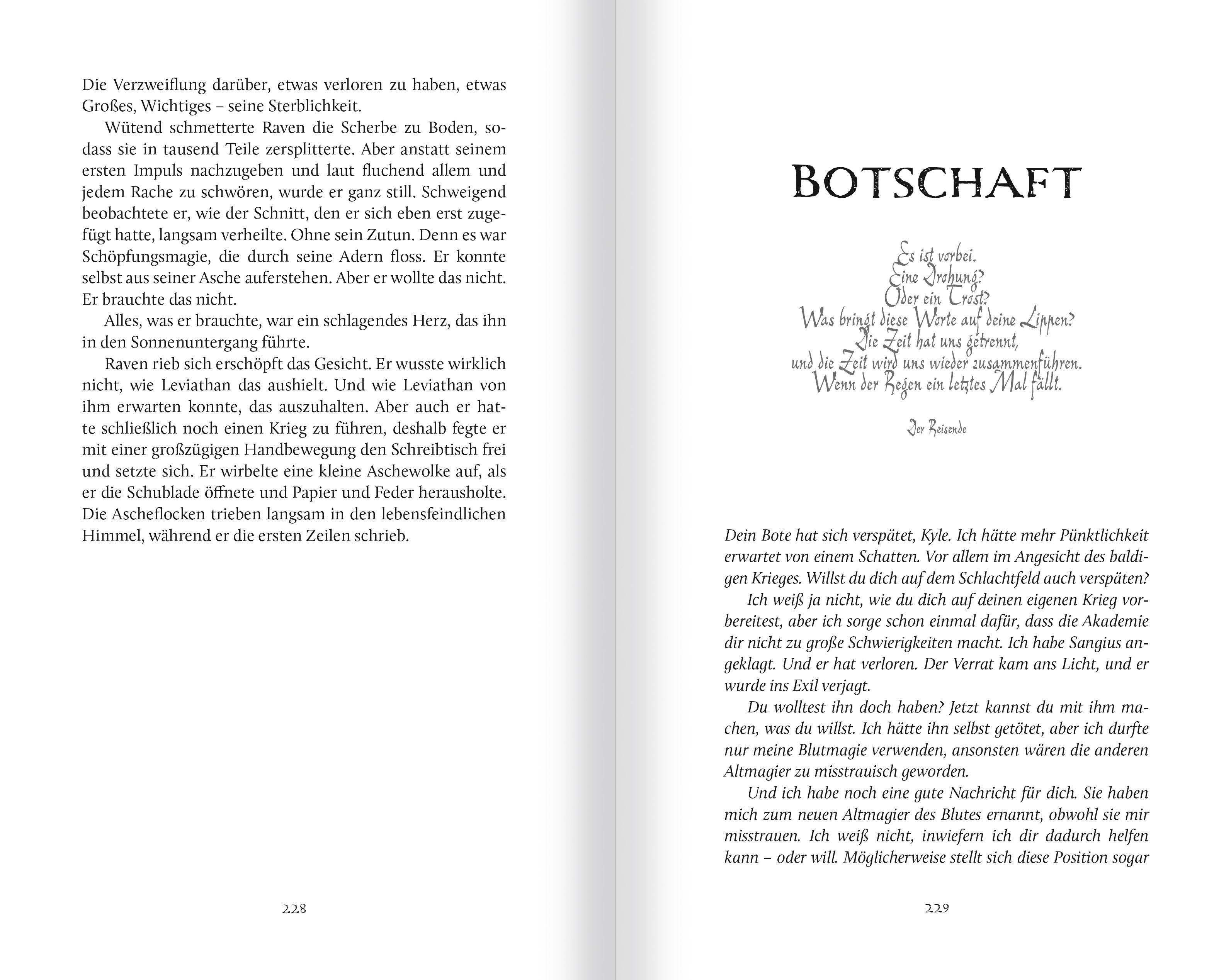 ((Auszug aus dem Kapitel "Maskenfall"))(...) Sangius widersprach nicht, dennoch hatte Merovan wohl das Gefühl, seine Entscheidung begründen zu müssen: "Solltet Ihr die Wahrheit sagen, werden wir es dadurch erfahren, solltet Ihr aber lügen ..." Er machte eine kurze Pause, man konnte ihm deutlich ansehen, wie sehr es ihm widerstrebte, diese Möglichkeit auch nur in Betracht zu ziehen. "Solltet Ihr uns tatsächlich verraten haben, müssen wir alles verhindern, was den Fürsten noch mehr in Rage versetzen könnte.""Ihr müsst Euch nicht rechtfertigen", lächelte Sangius. "Ich bin einverstanden." Natürlich war er das. Denn im Gegensatz zum jungen Raven konnte er selbst entscheiden, welche Gedanken er den Altmagiern offenbarte. Eine Fähigkeit, die er dem alten Herakles zu verdanken hatte, dem er einen langsamen, qualvollen Tod beschert hatte. Das Leben war ungerecht.Zodar trat vor ihn, und Sangius machte sich bereit. "Ich werde versuchen, es Euch nicht zu schmerzhaft zu machen", versprach der Dunkelmeister und schloss nach einem letzten schwermütigen Durchatmen die Augen.Sangius zuckte unwillkürlich zusammen, als die Dunkelmagie wie ein eisiger Blitz in seinem Kopf einschlug. Für einen Moment hätte ihn fast die Konzentration verlassen, aber er fing sich rechtzeitig wieder. Es war so unendlich einfach, dieses ach so perfekte Justizsystem zu überlisten. Dazu brauchte es nicht einmal Magie."Zodar?", fragte irgendwann Merovan ungeduldig, nachdem sich lange nichts getan hatte. "Gebt mir ein wenig Zeit, ich bin immerhin noch nie in so mächtige Gedanken eingedrungen", antwortete der Dunkelmeister; dann wurde es wieder still. Sangius ließ den Blick ein wenig schweifen. Über die Altmagier, die nicht wussten, was sie erwarten sollten, über den Dunkelmeister, der zwischen unzähligen Gedanken und der unüberwindbaren Mauer von Sangius' Konzentration die Wahrheit suchte, die er niemals finden würde, und über Raven, der nur danebenstand.Als er den Blick des Novizen traf, stutzte Sangius. Immer noch vollkommen regungslos, wie eine leblose Statue, stand er da und starrte. Starrte ihn an, als wollte er selbst in seine Gedanken sehen. Sangius musste sich widerwillig eingestehen, dass der eiskalte Ausdruck in seinen Augen ihn fast ein wenig beunruhigte.Er wandte sich wieder Zodar zu, der sichtlich mit einem Fluch kämpfte, weil die gewaltigen Gedanken eines Altmagiers doch ein wenig viel für ihn waren. Sangius offenbarte ihm einige Erinnerungen, die dem fraglichen Ereignis nahe kamen, um ihn nicht zu demotivieren, dann verfiel er wieder in tiefe Konzentration.Sangius wusste nicht so ganz, warum, aber als ihn ein kalter Schauer erfasste, der nicht von der Dunkelmagie in seinem Kopf stammte, zuckte sein Blick wieder zu Raven, der ihn nach wie vor regungslos anstarrte - wie ein Wahnsinniger. In beharrlicher Manie und völlig ausdruckslos. Das irritierte Sangius mit der Zeit so sehr, dass er fast die Kontrolle über seine Gedanken verlor. Aber diese Augen ... diese stechenden, kalten Augen ...Um sich abzulenken, schloss Sangius selbst die Augen, aber sogar jetzt spürte er noch den ausdruckslosen Blick auf sich ruhen, und es machte ihn noch verrückt! Wie ein schwerer Schatten, der an ihm hochkroch. Wie das dunkle Glühen brennender Knochen. Dieses unerträgliche, kalte Schweigen.Und als Sangius aufblickte und das Erste, was er sah, Ravens unberührter Blick war, hatte er das Gefühl, vollkommen den Verstand zu verlieren. Er büßte jede Kontrolle ein, wollte ihn am liebsten anfallen, ihn anschreien, auf ihn einschlagen, ihm seine Magie entgegenschleudern. Er wollte alles mit ihm machen, wozu sein brodelndes Blut ihn drängte, aber eine Stimme hielt ihn zurück."Was ist das?", wunderte sich Zodar. Sangius riss den Blick von Raven los und kam schlagartig wieder zu sich. Er wusste, was das zu bedeuten hatte, aber als er wieder seine Konzentration sammeln wollte, unterbrach ihn ein fast unerträglich kalter Schmerz. (...)