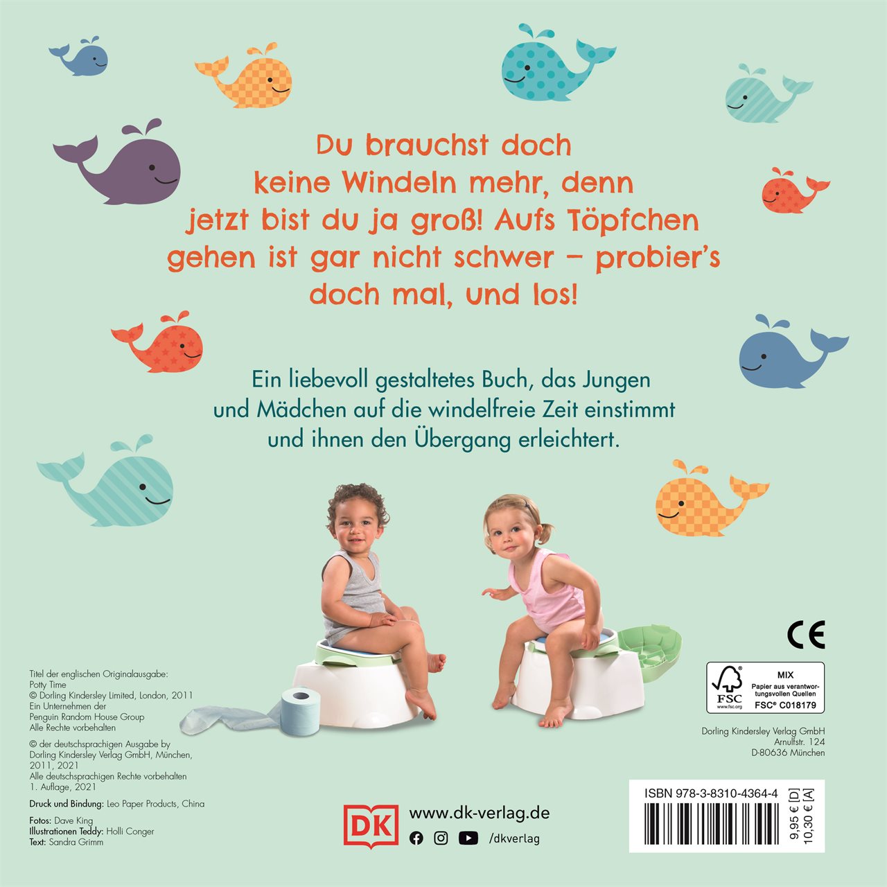 Dieses fröhliche Kinderbuch ab 2 Jahren mit dem witzigen Klodeckel auf dem Cover weckt ganz bestimmt das Interesse von Kleinkindern. Liebevoll gestaltet mit süßen Fotos anderer Kinder führt es altersgerecht in das Thema Töpfchen ein. Kleine Reime und kurze Texte sprechen Kinder auf Augenhöhe an und ein niedlicher kleiner Teddy begleitet durchs Bilderbuch. Die ideale Lektüre fürs Töpfchentraining und als Vorbereitung für die windelfreie Zeit!