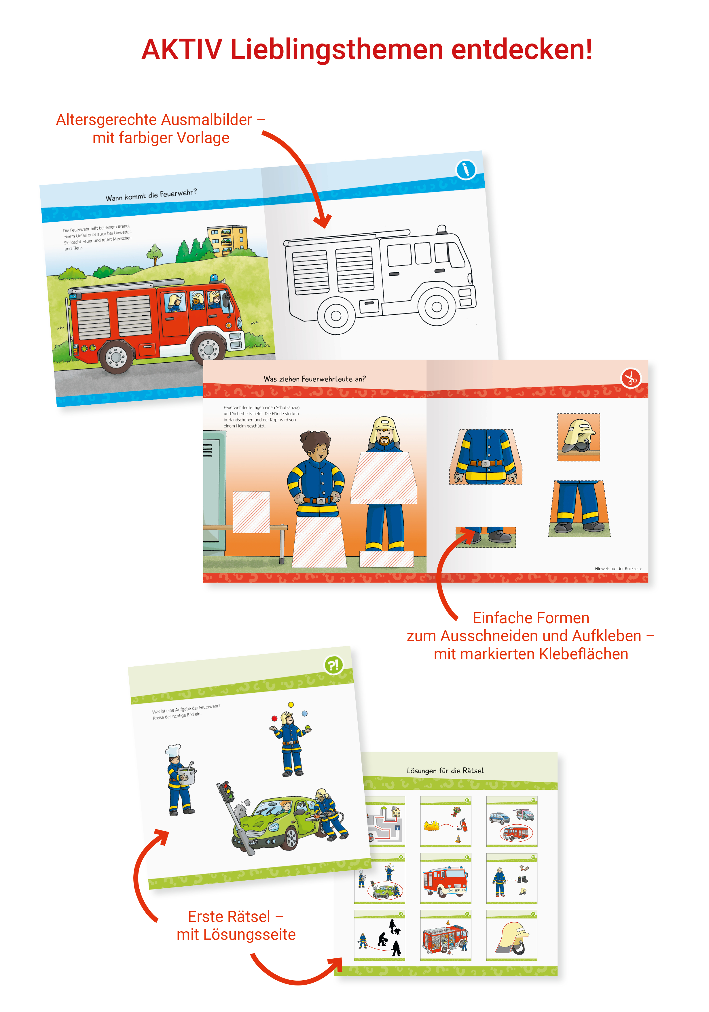 Was brauchen Feuerwehrleute für ihren Einsatz? Wie löschen sie ein Feuer? Und mit welchen Fahrzeugen sind sie unterwegs? Spielerisch beantwortet dieser Block erste Fragen rund um die Feuerwehr und lädt zum Kreativwerden ein: Kinder bekleben Einsatzkräfte mit ihrer Schutzkleidung, malen das Löschgruppenfahrzeug aus oder rätseln, was in den Rüstwagen gehört. Mit zahlreichen Aktivitäten tauchen Kinder in ihr Lieblingsthema ein.