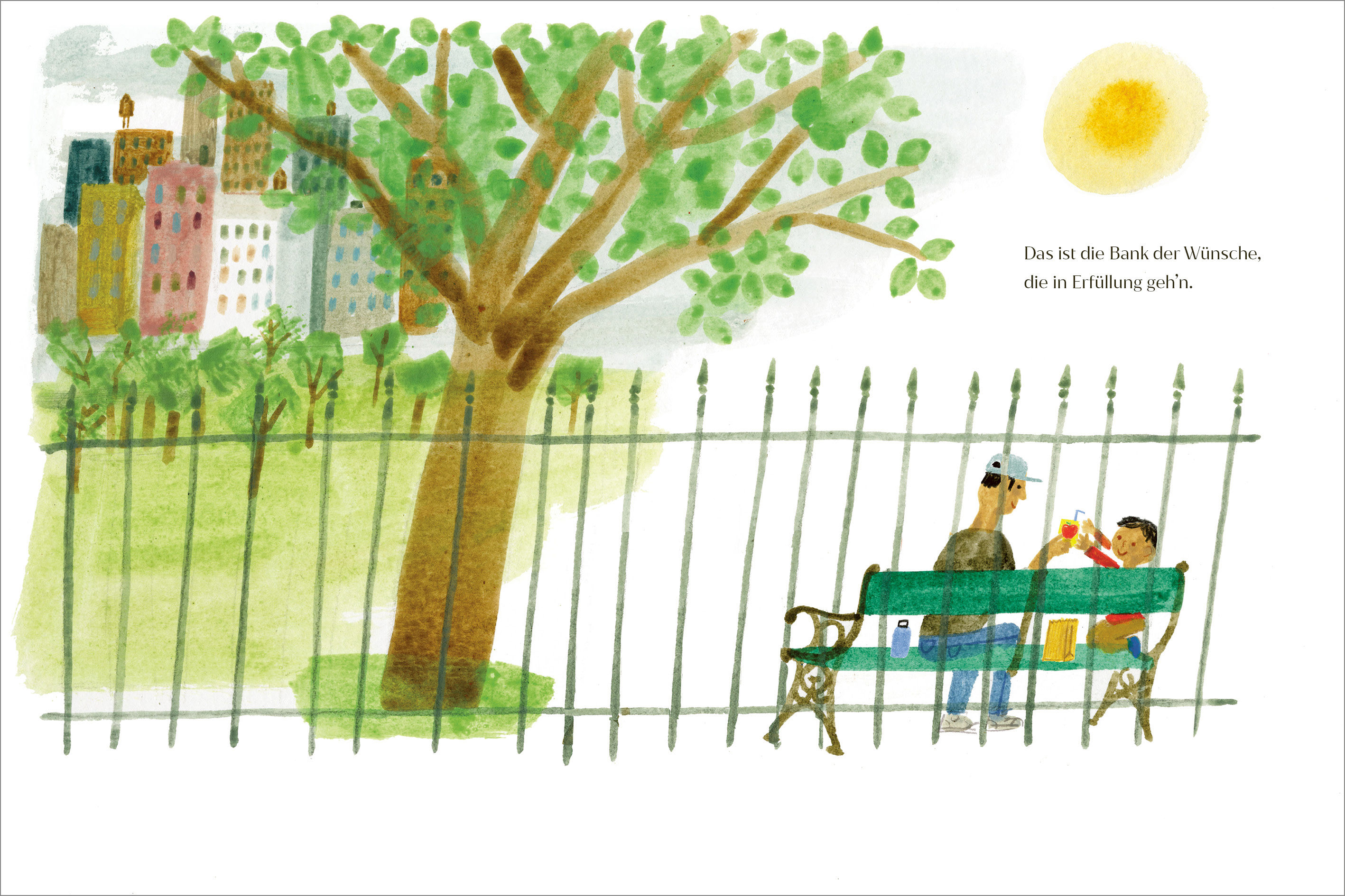 Die Bank ist der Ort, an dem sich Vater und Sohn begegnen. Hier hält die Zeit kurz inne, wenn sie ihre Freude, ihr Glück, ihre Träume und Erlebnisse teilen. Die Bank ist immer da, sie steht für die tiefe Verbundenheit zwischen Vätern und ihren Söhnen. Von hier aus erkunden sie die Welt, wachsen über sich hinaus und kehren doch immer wieder zurück an diesen Ort der Geborgenheit, der so verlässlich und tröstend ist wie die innige Liebe eines Vaters. In ihrem Vatertagsgedicht an Ehemann Harry fängt Herzogin Meghan kurz nach der Geburt von Sohn Archie auf wundervolle Weise die sich entwickelnde und wachsende Beziehung zwischen Vätern und ihren Söhnen in allen Lebenslagen ein. Eine zeitlose Liebeserklärung mit universeller Botschaft.