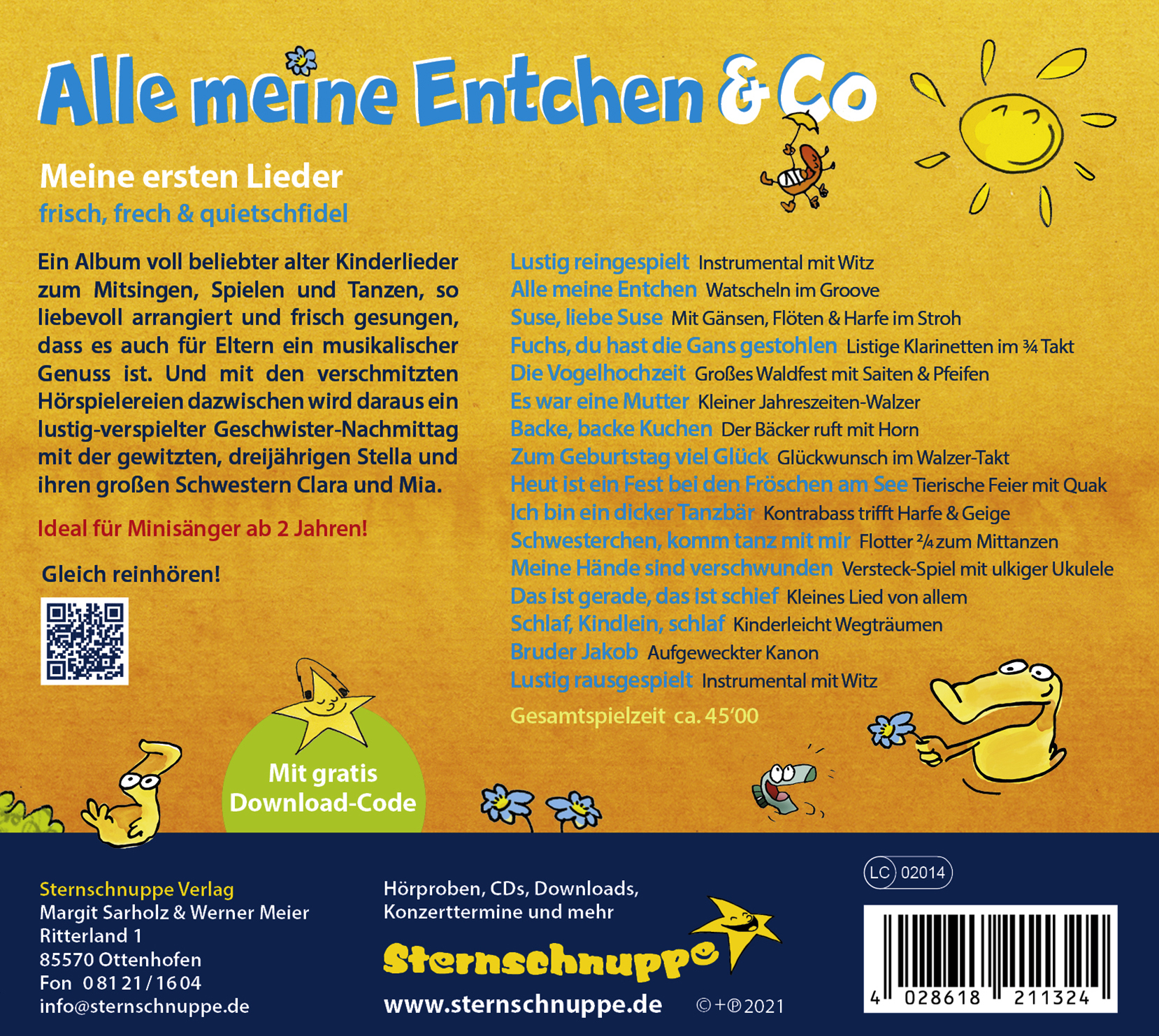 | Schlagworte | Alle meine Entchen • backe backe Kuchen • Bruder Jakob • das ist gerade das ist schief • Erste Lieder • Es war eine Mutter • Fuchs du hast die Gans gestohlen • Kinderlieder • Klassiker • Lieder für Kleinkinder • Meine Hände sind verschwunden • Schlaflied: Schlaf Kindlein schlaf • Schwesterchen komm tanz mit mir • Suse liebe Suse • Vogelhochzeit |