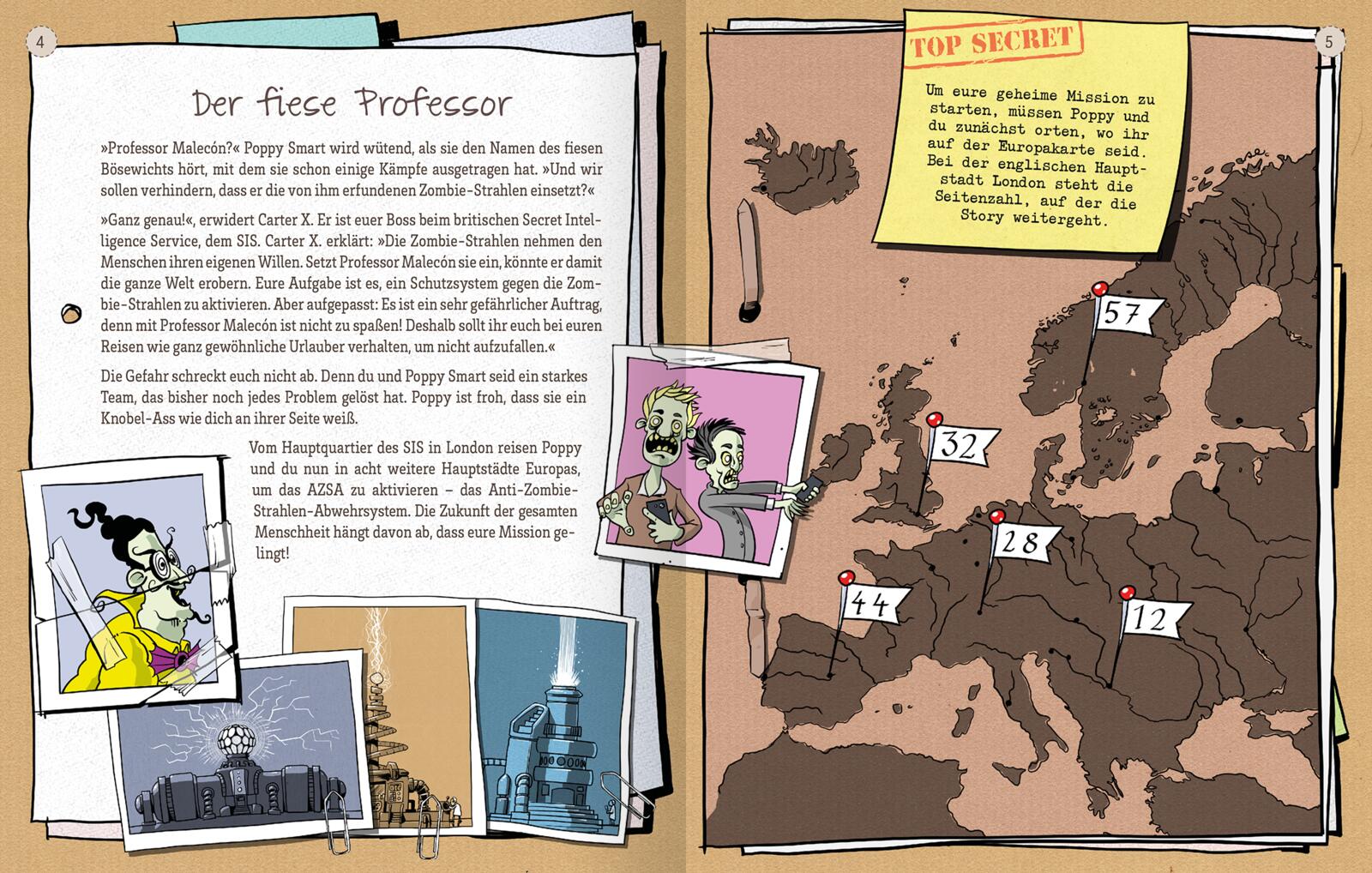 Ein Schutzsystem gegen Zombi-Strahlen zu aktivieren? - Das ist ein Fall für dich und deine Geheimagenten-Kollegin Poppy Smart! Gemeinsam reist ihr in ferne Länder, knackt kniffelige Rätsel und legt dem bösen Professor Malecon so das Handwerk.