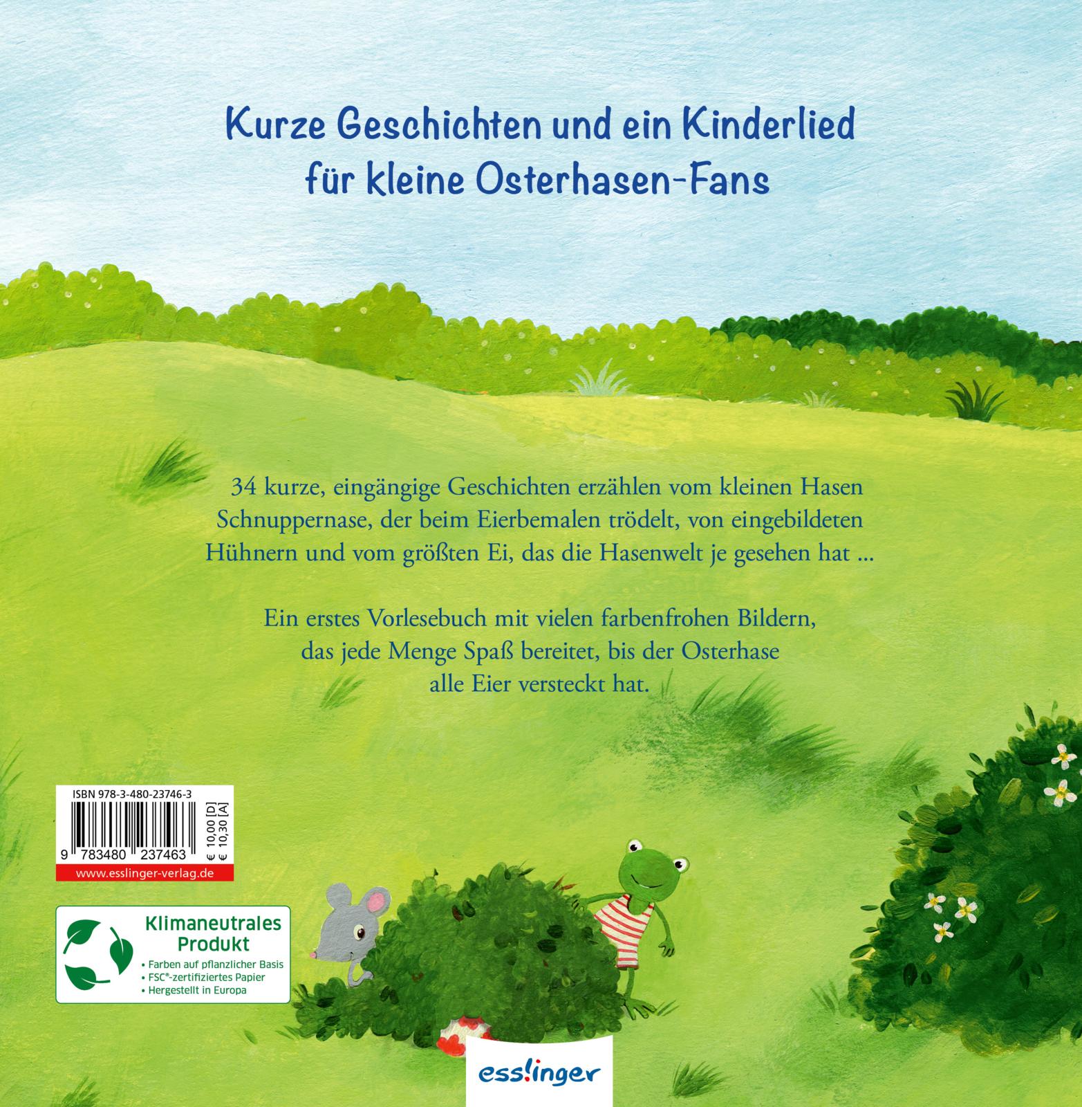 34 kurze, eingängige Geschichten und ein Kinderlied am Ende des Buches erzählen vom Hasen Schnuppernase, der beim Eier-Bemalen trödelt, von eingebildeten Hühnern, vom Frühling und dem größten Ei, das die Hasenwelt je gesehen hat ...