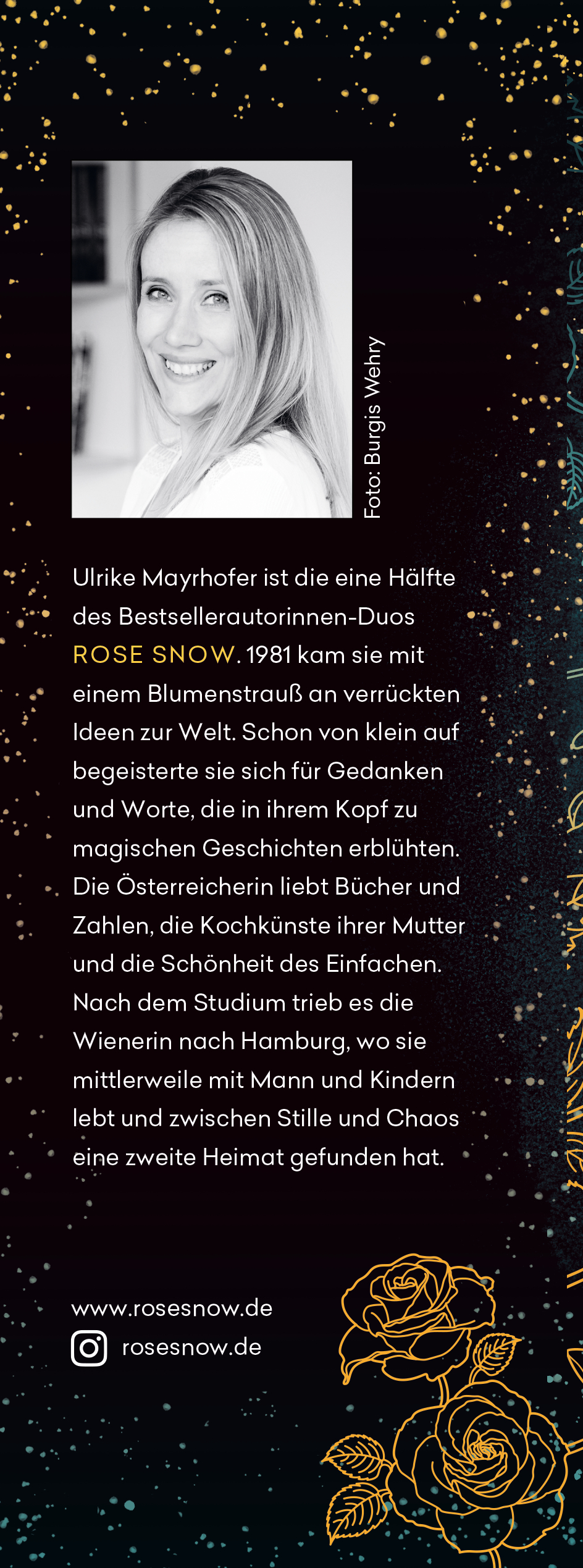 Hinter dem Pseudonym »Rose Snow« stecken Ulrike Mayrhofer und Carmen Schmit. Zusammen sind sie 80 Jahre alt, haben zwei Männer, sieben Kinder und drei Katzen. Die beiden Österreicherinnen mögen Zahlen, große und kleine, schreiben gerne, zusammen oder alleine, und teilen nicht nur den gleichen Humor, sondern auch die Liebe zum Geschichtenerfinden, die sich trotz der Distanz Wien-Hamburg in unzähligen Büchern verwirklicht.