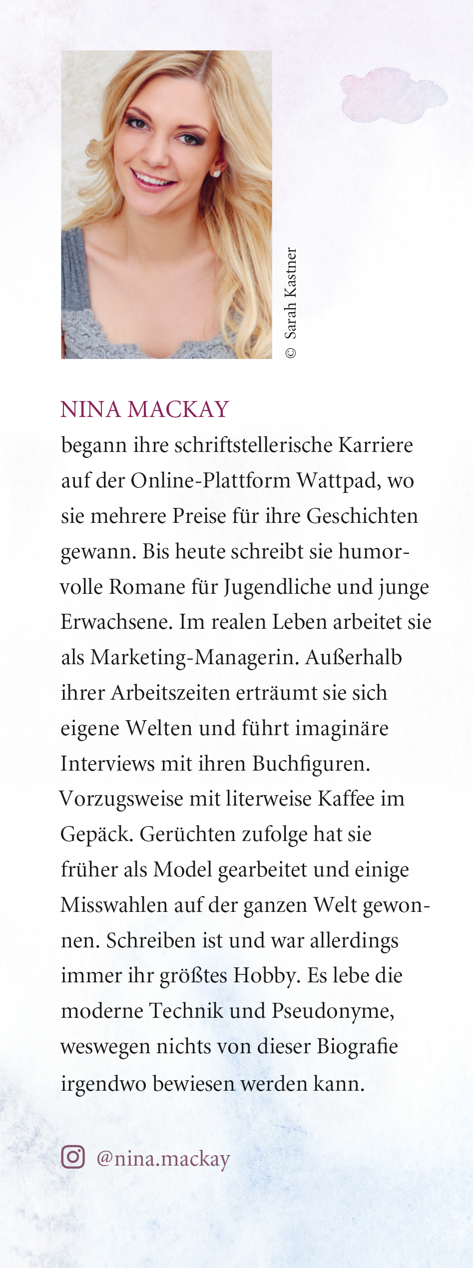 Nina MacKay begann ihre schriftstellerische Karriere auf der Online-Plattform Wattpad, wo sie mehrere Preise für ihre Geschichten gewann. Bis heute schreibt sie humorvolle Romane für Jugendliche und junge Erwachsene. Im realen Leben arbeitet sie als Marketing Managerin. Außerhalb ihrer Arbeitszeiten erträumt sie sich eigene Welten und führt imaginäre Interviews mit ihren Buchfiguren. Vorzugsweise mit literweise Kaffee im Gepäck.
