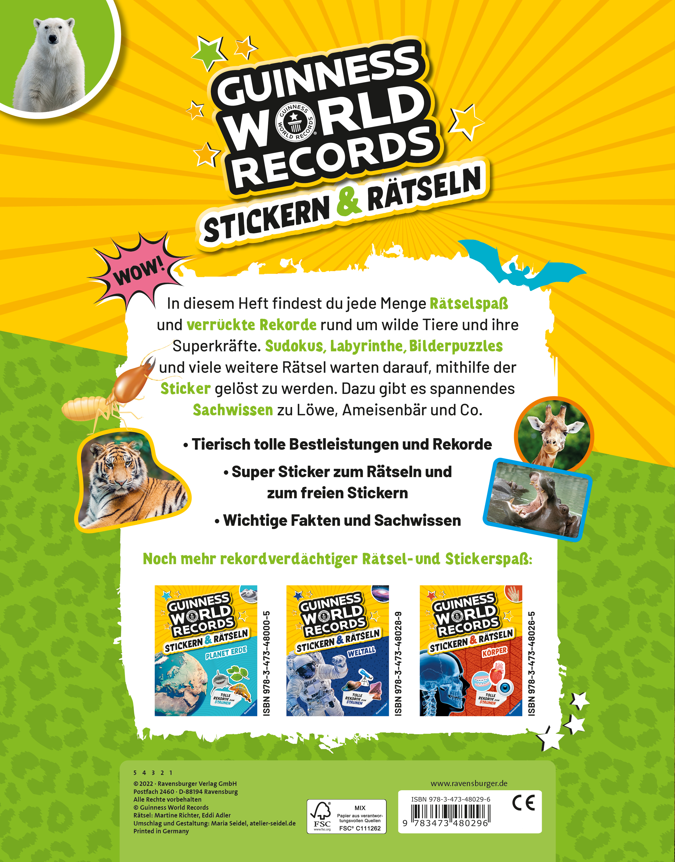 Dieses Rätsel- und Stickerheft bietet eine faszinierende Weltreise zu den Rekorden, die das Tierreich zu bieten hat. Eine Vielzahl unterschiedlicher Rätselarten, teilweise mit Stickeraufgaben, sorgt für abwechslungsreiche und spannende Unterhaltung. Dazu gibt es Superlative und Höchstleistungen aus dem Guinness World Records Universum.