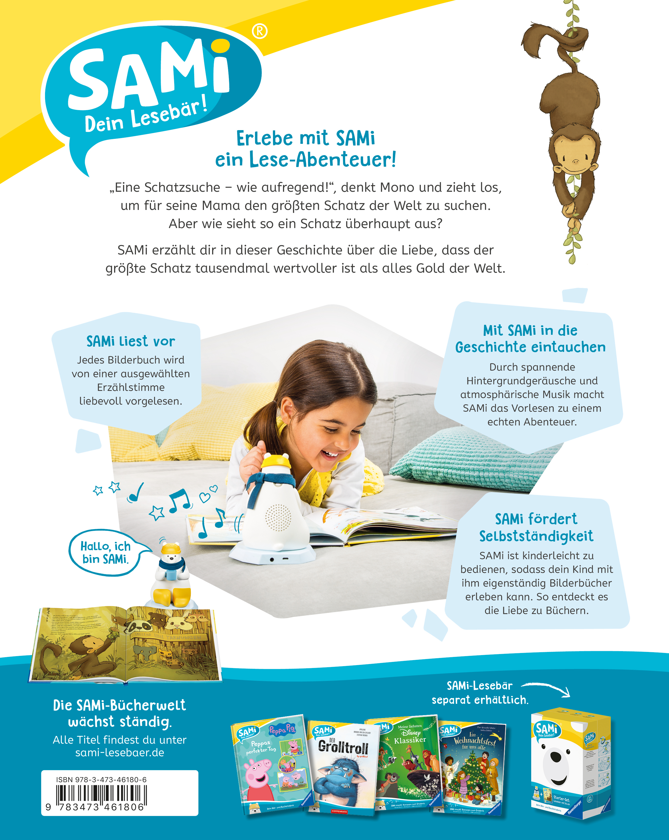Mit SAMi - dein Lesebär tauchen Kinder ab 3 Jahren selbstständig in die Welt der Bilderbücher ein. Einfach ans Buch gesteckt, liest SAMi die Geschichte vor, während das Kind durch das Buch blättert. Dabei erkennt SAMi genau, auf welcher Seite sich das Kind befindet. Das Kind kann auf diese Weise frei im Buch vor- und zurückblättern und seine Lieblingsgeschichten beliebig oft anhören. So fördert SAMi die Selbstbeschäftigung und regt die Fantasie der Kinder an. SAMi kann verschiedene Bücher zu den unterschiedlichsten Themengebieten vorlesen: Neben wichtigen Themen aus dem Kinderalltag (z.B. Freundschaft, Streit), gibt es auch witzige Abenteuer und spannende Geschichten mit den Helden aus Filmen und Serien.