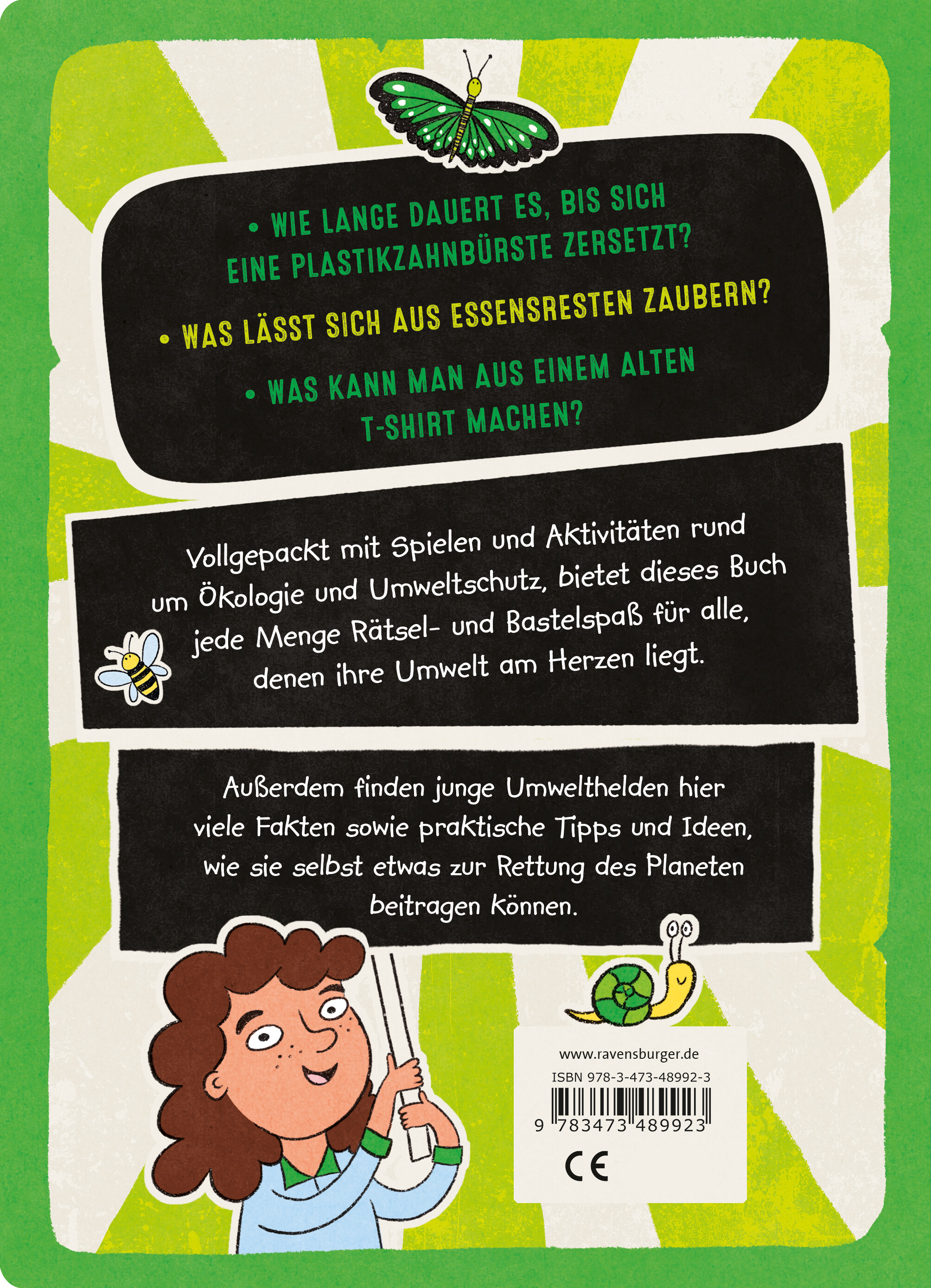 Vollgepackt mit Spielen und Aktivitäten rund um Ökologie und Umweltschutz, bietet dieses Buch Inspiration und Unterhaltung für alle Kinder, denen ihre Umwelt am Herzen liegt. Beim Knobeln und Rätseln setzen sich Kinder ganz nebenbei mit aktuellen Umweltthemen auseinander und erhalten viele Infos zu den Themen Natur-, Klima- und Umweltschutz. Außerdem finden jungen Leser zahlreiche praktische Tipps und Ideen, wie sie selbst aktiv werden und einen Beitrag zur Rettung unseres Planeten leisten können.
