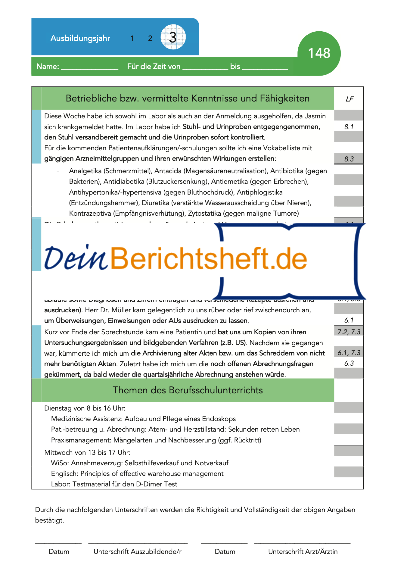 | Zusatzinfo | Alle 150 wöchentliche Berichte sind originalgetreu in einer Berichtsheftvorlage niedergeschrieben (nach den Vorgaben der Ärztekammer) - im frischen Grünton als Rahmenfarbe |