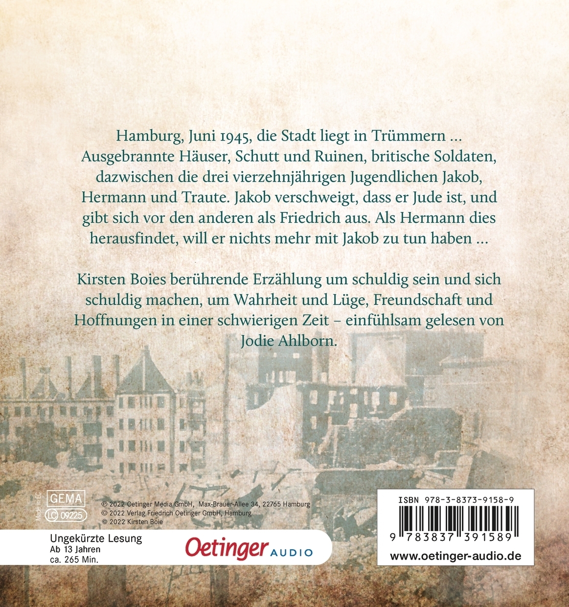 Hamburg, Juni 1945: Die Stadt liegt in Trümmern. Mittendrin leben Traute, Hermann und Jakob. Der nennt sich allerdings Friedrich, denn niemand soll erfahren, dass er Jude ist. Als Hermann ihm dennoch auf die Spur kommt, will er nichts mehr mit Jakob zu tun haben. Schuld, Wahrheit, Angst und Wut sind die zentralen Themen dieses Buchs, dessen jugendliche Hauptfiguren durch die Schrecken des Krieges und der Naziherrschaft miteinander verbunden sind. Und für die es doch immer wieder Lichtblicke gibt.