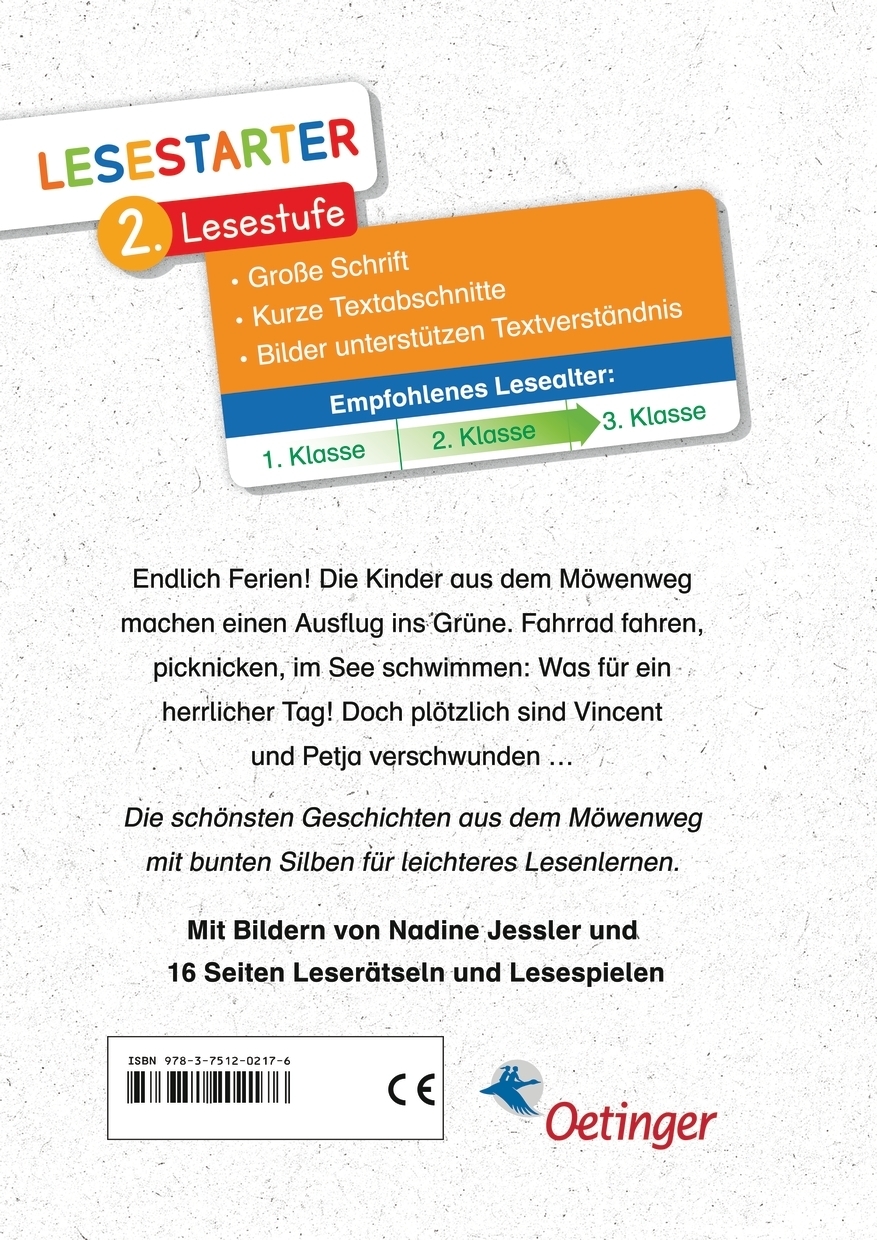 | Schlagworte | 2. Klasse • Abenteuer • Abenteuer im Möwenweg • Ausflug • bunte Illustrationen • einfacher Wortschatz • Erstes Lesen • Familie • Flüssiges Lesen • Geschwister • Grundschulbuch • Grundschule • Illustration • Kinderbuchreihe • kurze Sätze • Lernbuch • Leseförderung • Lesen lernen • Lesenlernen • Leseübung • Leseverständnis • Schulanfang • Schwimmen gehen • Silben • Sommerferien • Spaß • Sprachentwicklung • Viele Bilder • Wortaufbau • Wortbildung • Wörter entschlüsseln |
