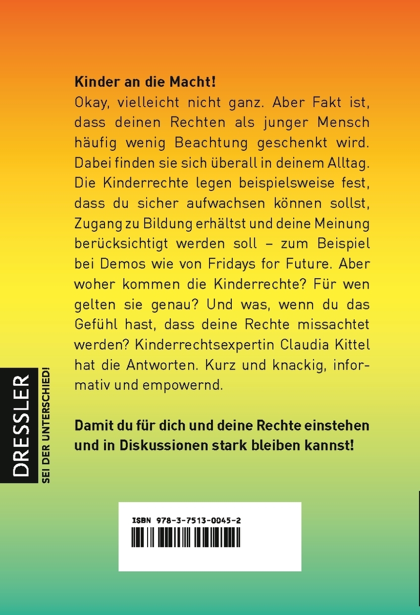 | Schlagworte | Aktivismus • Booktok • Demokratie • Engagement • Fridays For Future • Jugendbuch • Jugendsachbuch • Kinderrechte • Kinderrechte ins Grundgesetz • Kinderschutz • Kindeswohl • Menschenrechte • Mitspracherecht • Politik für Jugendliche • Recht auf Beteiligung • Recht auf Bildung • Rechte von Jugendlichen • Rechte von Kindern • Sachbuch für Jugendliche • United Nations • UN-Kinderrechtskonvention • Vereinte Nationen • Vorwort von Luisa Neubauer |