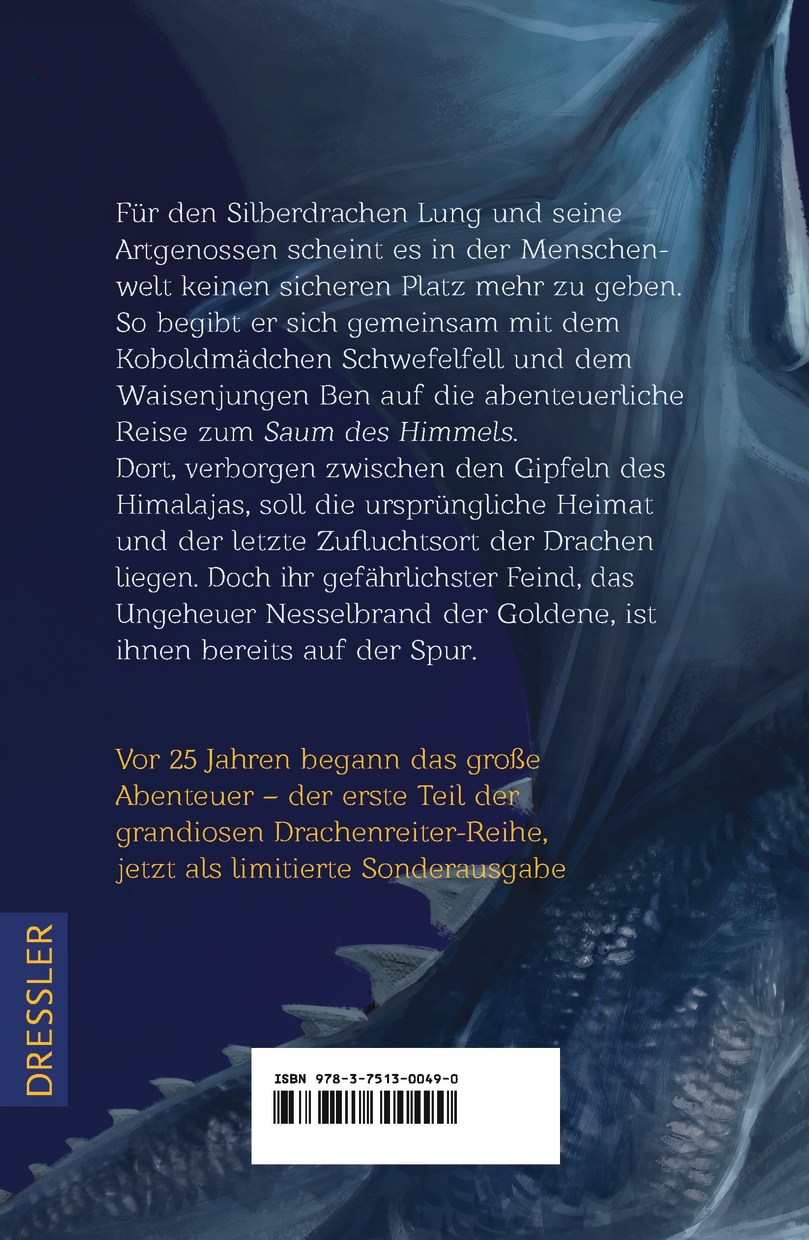 Der silberne Drache Lung und seine Begleiter, Koboldmädchen Schwefelfell und Waisenjunge Ben, sind auf der Suche nach einem sicheren Ort für Lungs Artgenossen. Denn für sie scheint es in der Menschenwelt keinen Platz mehr zu geben. Lung setzt seine ganze Hoffnung auf den sagenumwobenen Saum des Himmels. Dort, irgendwo zwischen den Gipfeln des Himalaya versteckt, soll die ursprüngliche Heimat der Drachen liegen. Jedoch ahnen die drei nicht, dass es etwas viel Bedrohlicheres als Menschen gibt: Nesselbrand den Goldenen. Das gefährlichste drachenjagende Ungeheuer, das die Welt je gesehen hat, folgt ihnen dicht auf den Fersen.