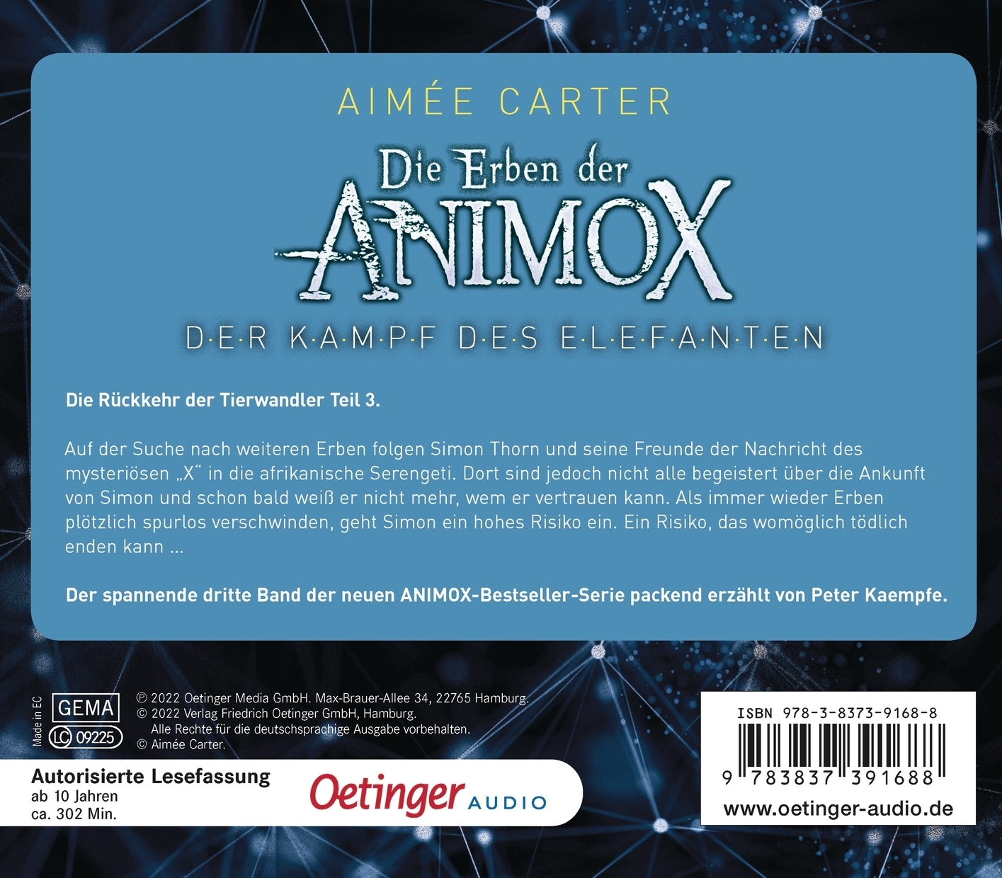 Nachdem Gestaltwandler Simon Thorn und seine Freunde erfahren haben, dass der geheimnisvolle X Suki und Kai verschleppt hat, folgen sie seiner Spur nach Afrika, um die beiden zu befreien. Und natürlich wollen sie dort auch endlich den verschwundenen Raubstein finden. Auf die Hilfe seines Bruders Nolan braucht Simon dabei nicht zu hoffen, denn der wird mehr und mehr zu seinem Feind. Autorin Aimée Carter ist ein weiterer Tierfantasy-Roman mit Bestsellerpotenzial gelungen. Denn auch der neue Teil der zweiten Animox-Reihe verspricht Hochspannung pur und steckt voller aufregender Überraschungen!