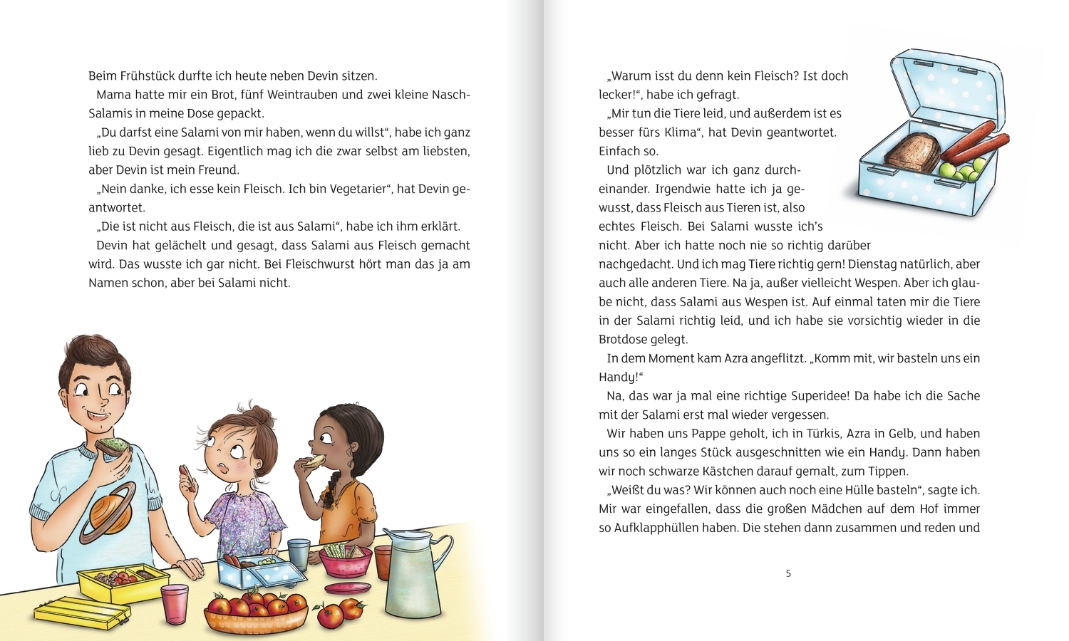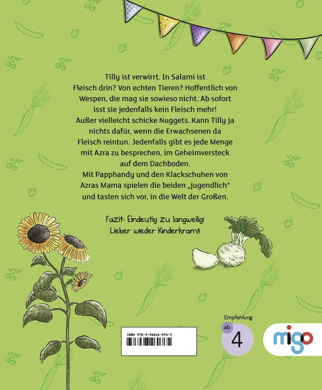 Tilly mag den Erzieher im Kindergarten richtig gern. Er heißt Devin und ist Vegetarier. Aber was ist eigentlich so ein Vegetarianer? Tilly stellt mit Entsetzen fest, dass ihre Salami nicht aus Salami, sondern aus Fleisch ist. Und nicht mal aus so lästigen Tieren wie Wespen. Mit ihrer Freundin Azra bespricht sie ihr neues Vorhaben, jetzt Vegetarierin zu werden. Aber die Mädchen haben natürlich noch anderes im Kopf, außer sich über Essen Gedanken zu machen. Mit künstlichen Nägeln aus dem Mensch-ärgere-Dich-nicht-Spielkasten, selbstgebastelten Handys und den Klackerschuhen ihrer Mütter spielen sie cool und groß zu sein. Und Tilly versucht tapfer, ihre Würstchen gegen Karotten einzutauschen. Jetzt ist sie schon fast Vegetarierin. Zumindest bis sie morgen mit Papa eine kleine Ausnahme macht und Schicken Nuggets essen geht.