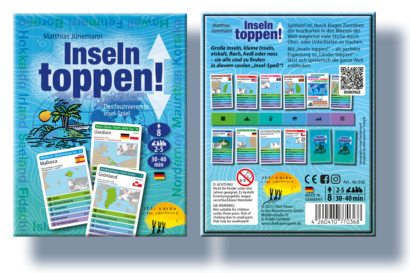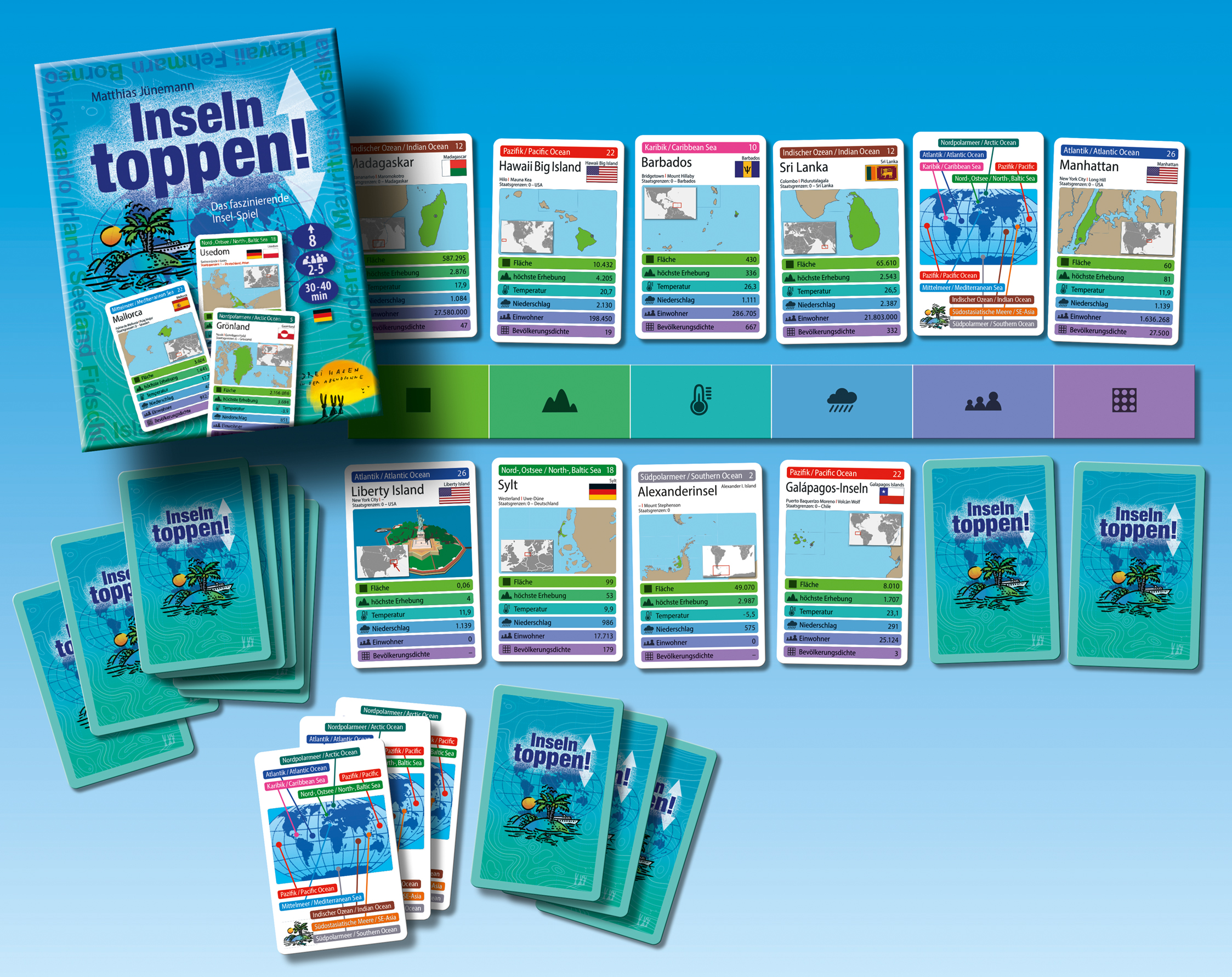 Das faszinierende Insel-Spiel!"Große Inseln, kleine Inseln,eiskalt, flach, heiß oder nass- sie alle sind zu findenin diesem coolen "Insel-Spaß"!"Spielziel ist es, durch kluges Zuordnen der Inselkarten in den Meeren der Welt möglichst viele Stiche durch Über- oder Unterbieten zu machen.Mit "Inseln toppen!" - als perfekte Ergänzung zu "Länder toppen!" - lässt sich spielerisch die ganze Welt entdecken.
