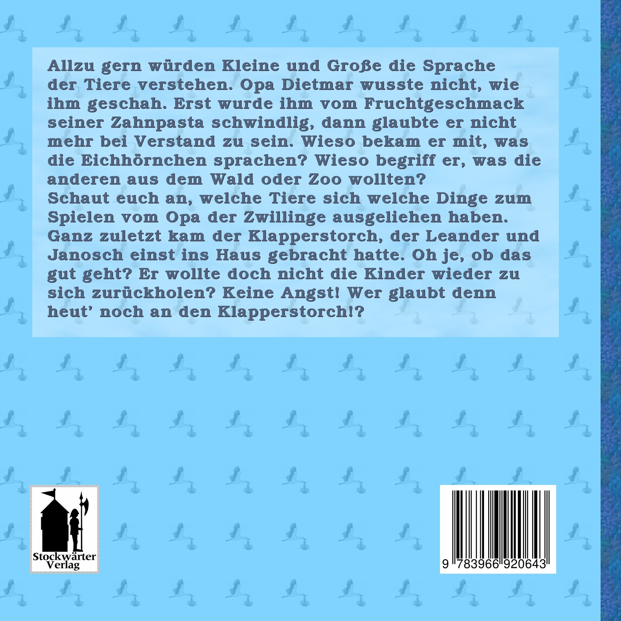 Schaut euch an, welche Tiere sich welche Dinge zum Spielen vom Opa der Zwillinge ausgeliehen haben. Ganz zuletzt kam der Klapperstorch, der Leander und Janosch einst ins Haus gebracht hatte. Oh je, ob das gut geht? Er wollte doch nicht die Kinder wieder zu sich zurückholen? Keine Angst! Wer glaubt denn heut' noch an den Klapperstorch!?