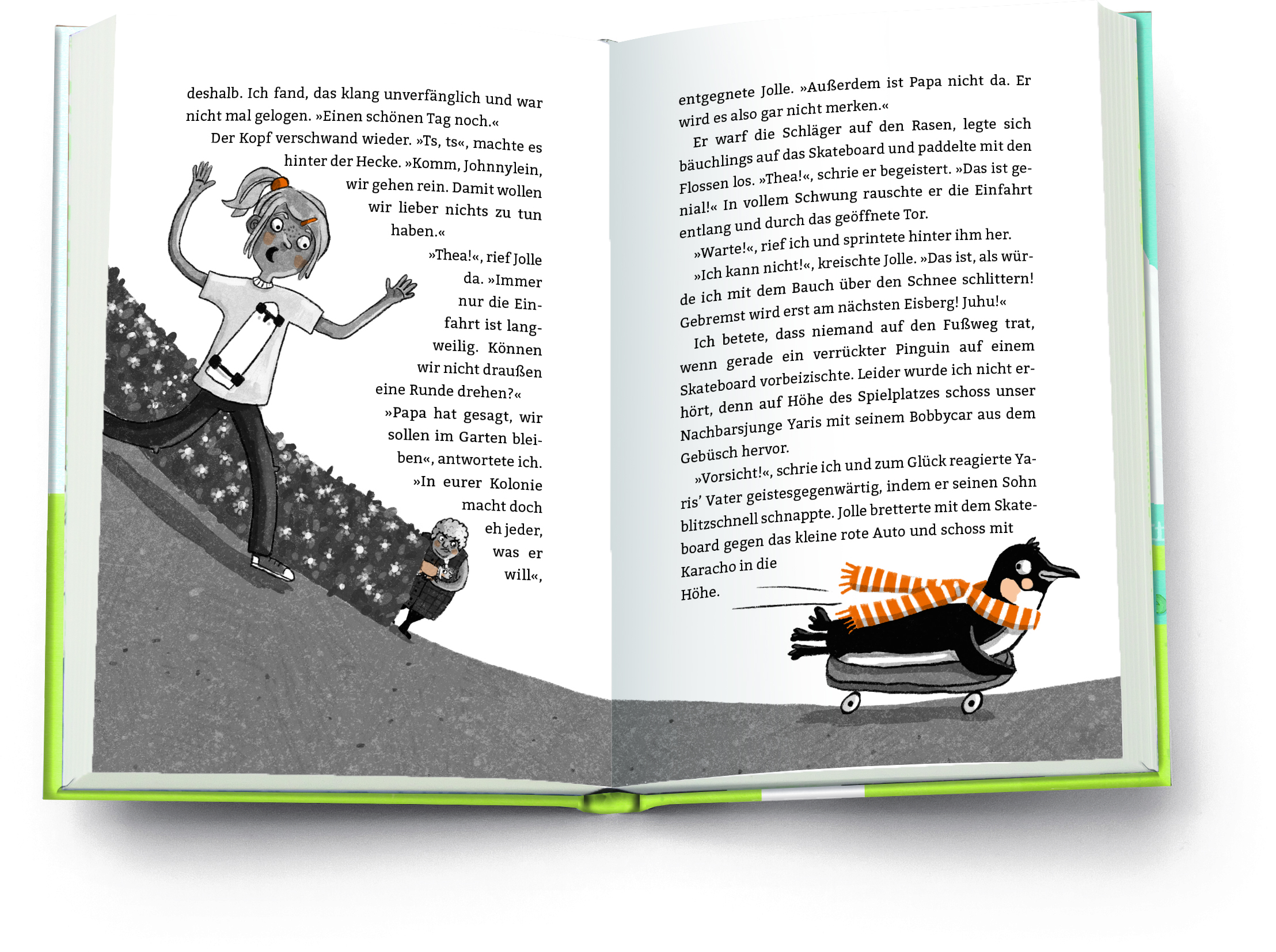 Thea traut ihren Augen kaum, als sie plötzlich einen Pinguin in ihrem Garten entdeckt. Und dann spricht der auch noch! Ab diesem Moment wirbelt Pinguin Jolle den Alltag von Theas Familie gehörig durcheinander. Er richtet sich im Badezimmer häuslich ein, plündert die Vorräte der Tiefkühltruhe und wird bald zum beliebtesten Instagram-Motiv von Theas Schwester. Schnell werden Thea und Jolle die dicksten Freunde und stellen zusammen die Welt auf den Kopf. Doch wie viel Chaos verträgt eine Familie? Und kann Jolle wirklich bleiben?