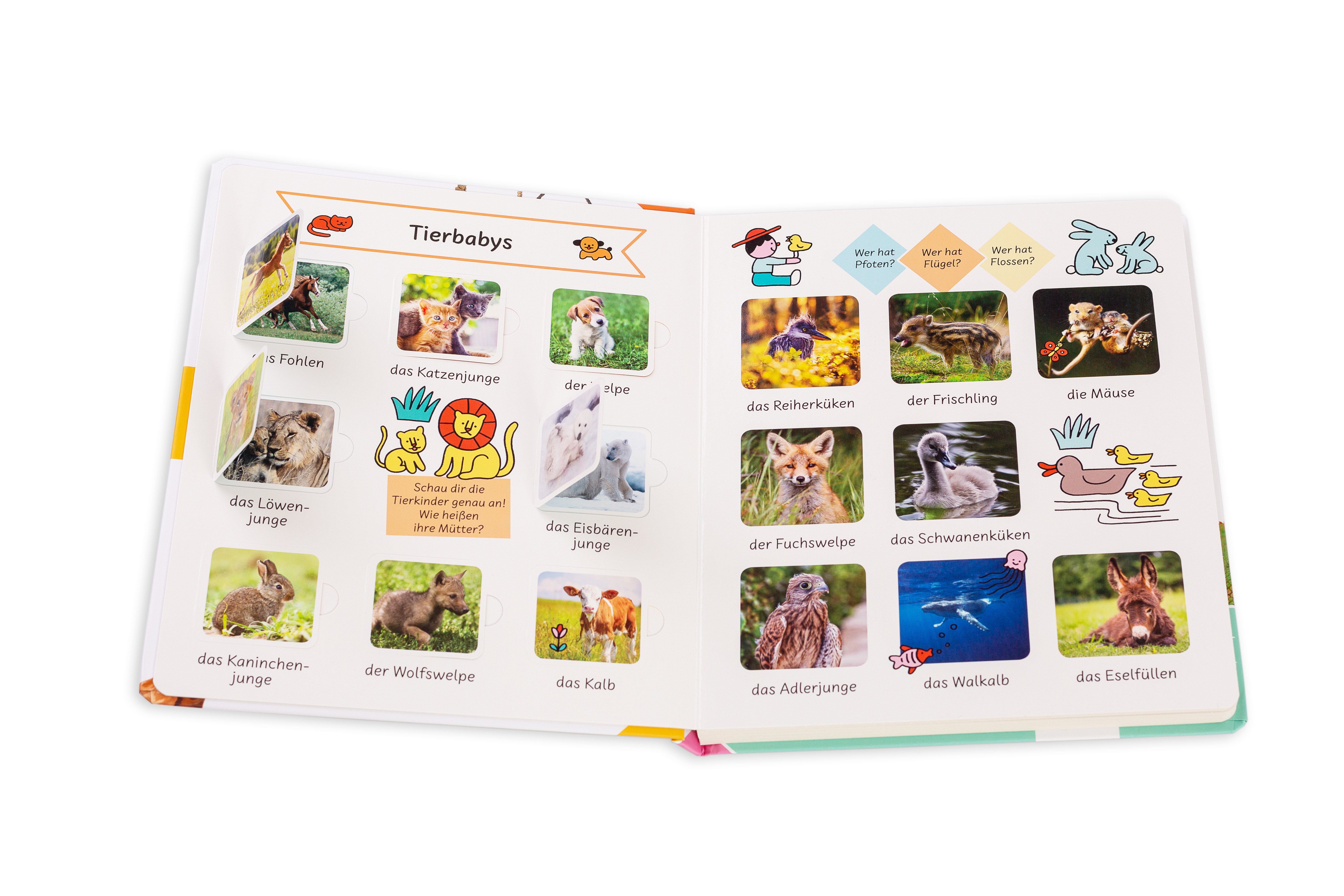 Wie heißen die Jungtiere? Wer lebt in einem Nest? Welche Tiere haben ein Fell? Das und vieles mehr lernen Kinder ab zwei Jahren spielend mit einfachsten Fragen und Rätseln, vielen Klappen, lustigen Illustrationen und Fotos.