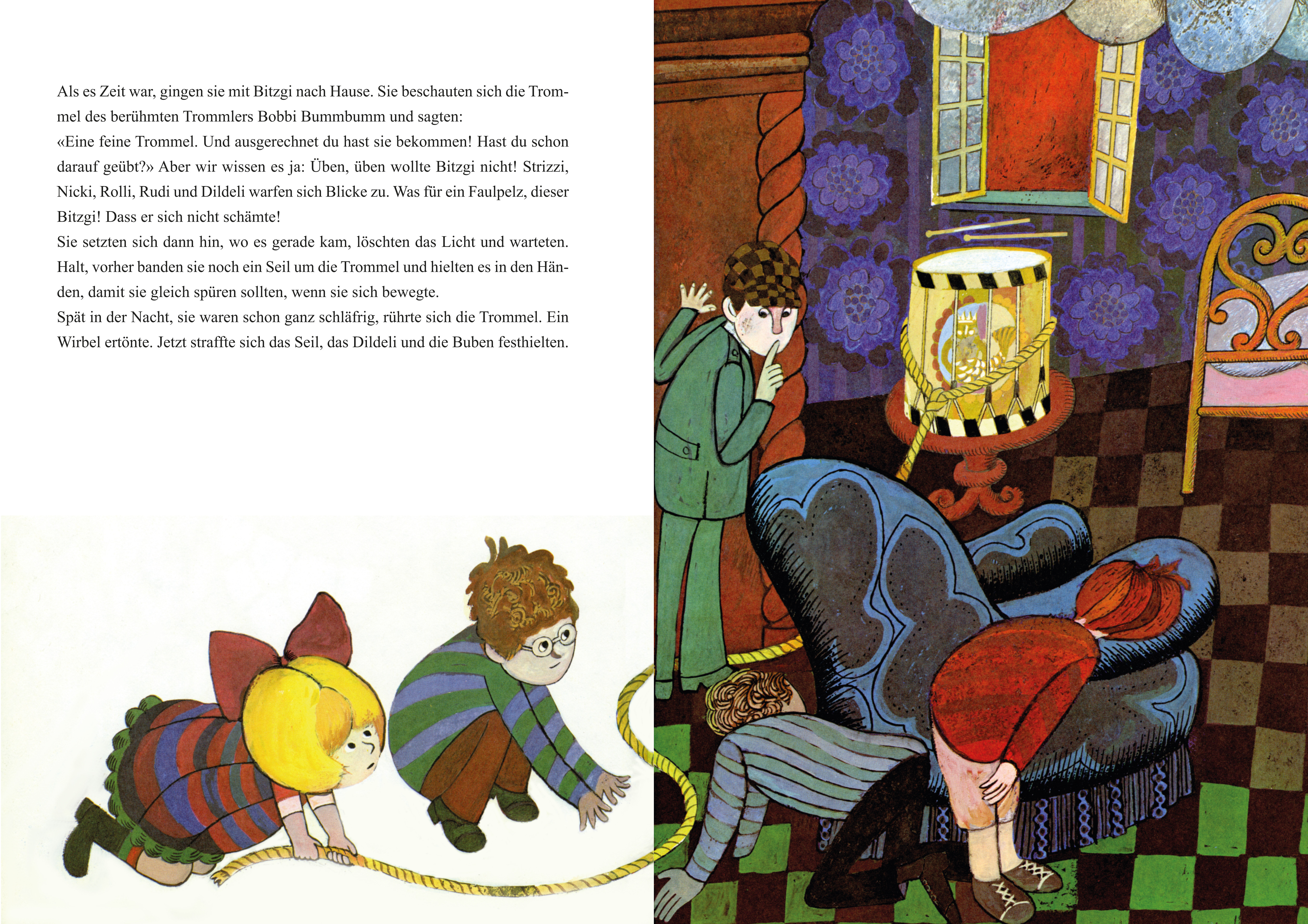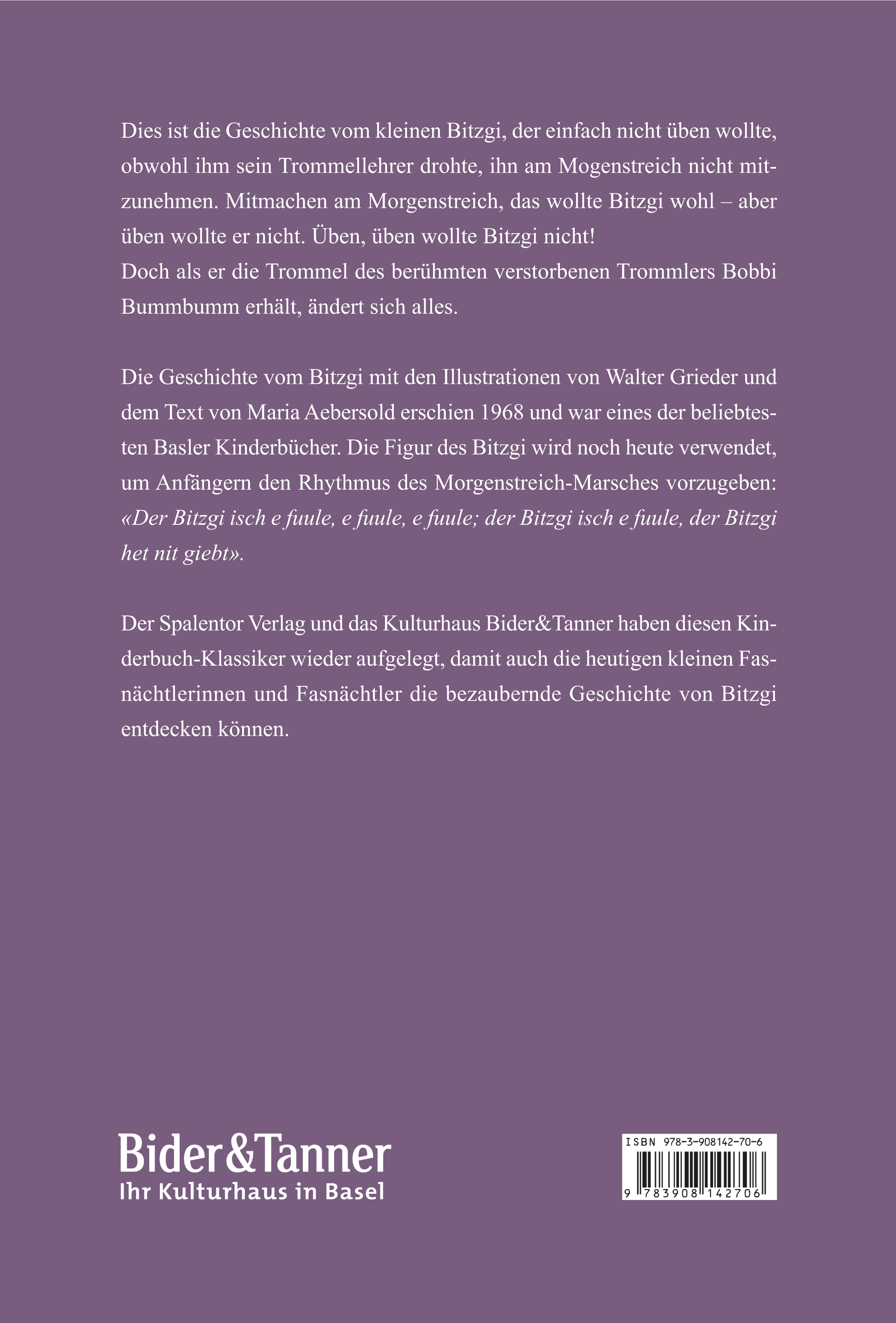 Dies ist die Geschichte vom kleinen Bitzgi, der einfach nicht üben wollte, obwohl ihm sein Trommellehrer drohte, ihn am Mogenstreich nicht mitzunehmen. Mitmachen am Morgenstreich, das wollte Bitzgi wohl – aber üben wollte er nicht. Üben, üben wollte Bitzgi nicht! Doch als er die Trommel des berühmten verstorbenen Trommlers Bobbi Bummbumm erhält, ändert sich alles.