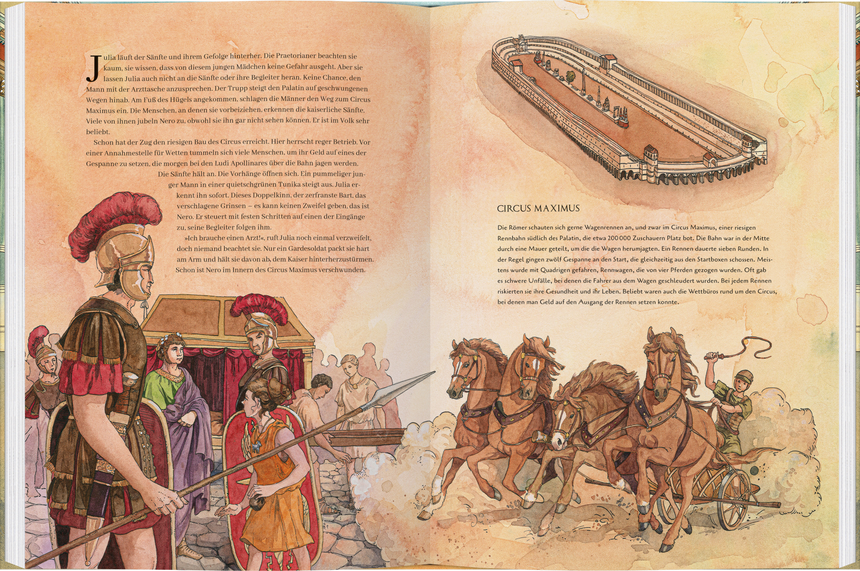 Im Jahre 64 n. Chr. begibt sich die elfjährige Julia auf eine Odyssee: In der Millionenmetropole Rom muss sie Daniel Maltinus finden, den einzigen Arzt, der ihren schwerkranken Vater noch retten kann. Eine abenteuerliche Spurensuche beginnt und führt Julia von ihrem Zuhause auf dem vornehmen Esquilin zu den Senatoren auf dem Forum Romanum, in die Subura, das Arme-Leute-Viertel der Stadt, und hinauf zum Kaiserpalast. An Julias Seite lernen wir das Leben der alten Römer, die Geschichte ihres riesigen Reiches und die berühmten Bauwerke der antiken Stadt kennen: die Tempel, Theater und Thermen, den Circus Maximus und die Gladiatorenschule. Und wir begegnen sogar dem Kaiser selbst, Nero höchstpersönlich!