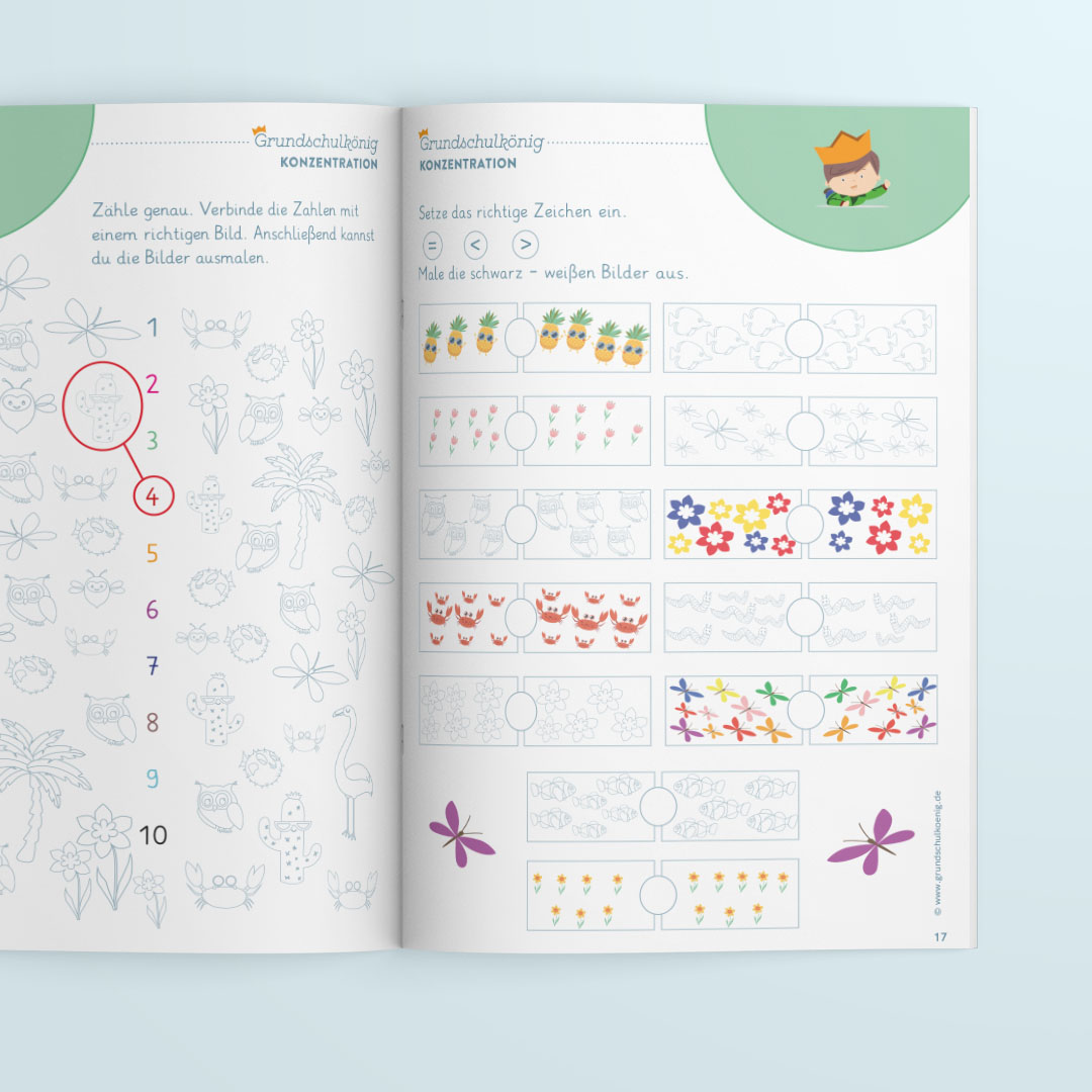 Mit dem Arbeitsheft zum Thema “Schwungübungen, Zahlen & Konzentration für die Vorschule” könnt Ihr spielerisch erste Schwungübungen für späteres Buchstaben schreiben üben. Außerdem findet ihr darin verschiedene Seiten mit Konzentrationstrainings, Ausmal- und Zuordenbilder und viele weitere Übungen. Bestens geeignet auch für den Englisch-Unterricht in der Grundschule.