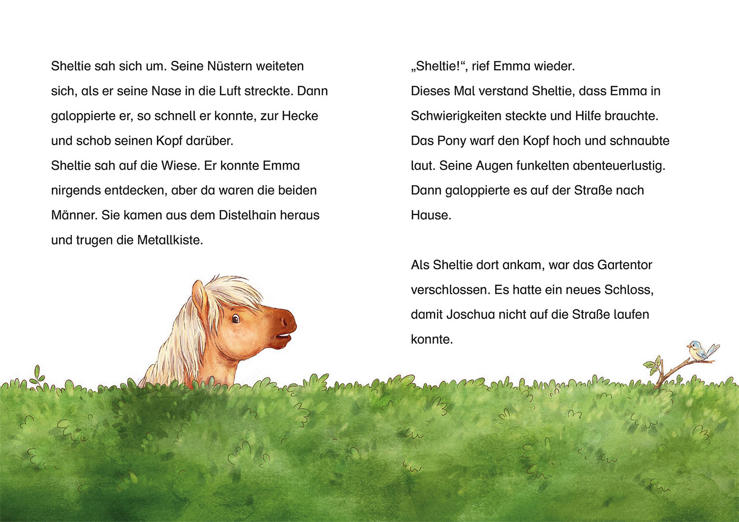 Lustige Pony-Abenteuer - viele bunte Bilder - einfach zu lesen!Zum Vorlesen und Lesen üben ab 7 Jahren.Lustig, klug und ganz schön frech - so ist Emmas Pony Sheltie. Gemeinsam erleben die beiden aufregende Abenteuer und haben eine Menge Spaß!Oh nein: Bauer Berg muss seine Wiese verkaufen! Dann können Sheltie und Emma dort nicht mehr zum Ausreiten hin. Doch zum Glück findet Sheltie die Lösung in Form einer alten Schatzkarte. Es wäre doch gelacht, wenn Emma und ihr schlaues Pony den Schatz nicht finden und so den Verkauf der Wiese verhindern könnten.