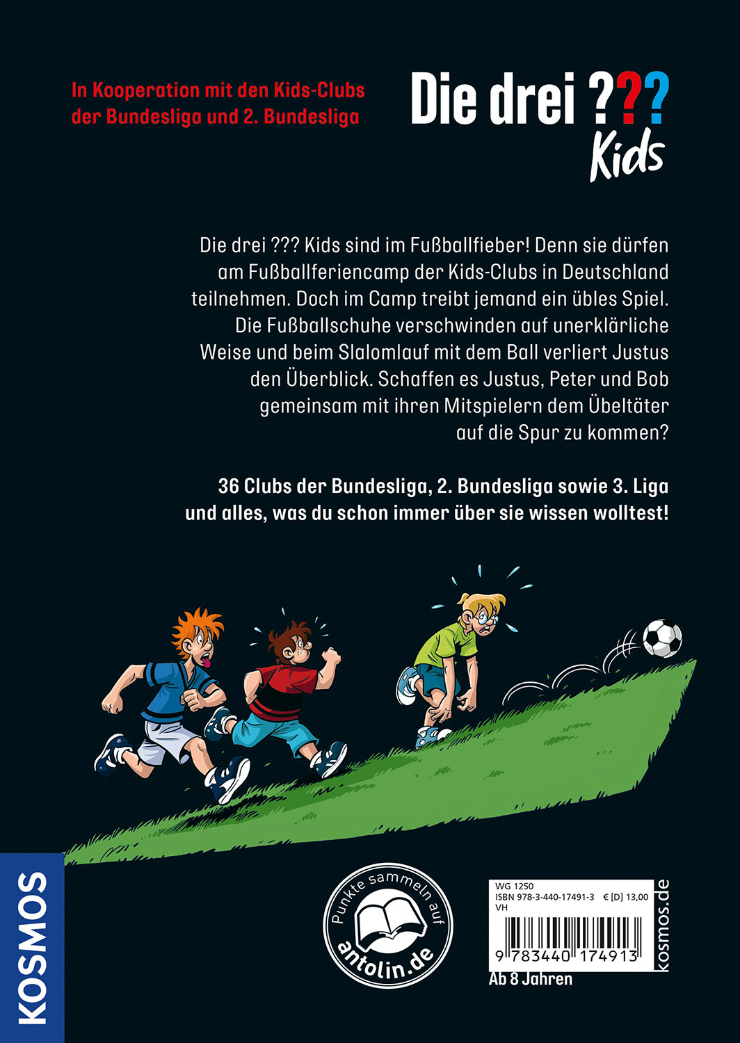 Justus, Peter und Bob sind beste Freunde und Detektive! Zusammen haben die drei ??? schon viele knifflige Fälle gelöst.Endlich Ferien - und was für welche! Justus, Peter und Bob nehmen an einem Fußballcamp der Bundesliga-Kids-Clubs teil. Doch kaum sind die Zelte aufgebaut, werden die drei Freunde beschuldigt, falsch zu spielen. Wer steckt dahinter? Der rasante Fall führt die Detektive durch 36 Clubs der Bundesliga, 2. Bundesliga und 3. Liga. Hier findet bestimmt jeder Fan seinen Lieblingsverein!