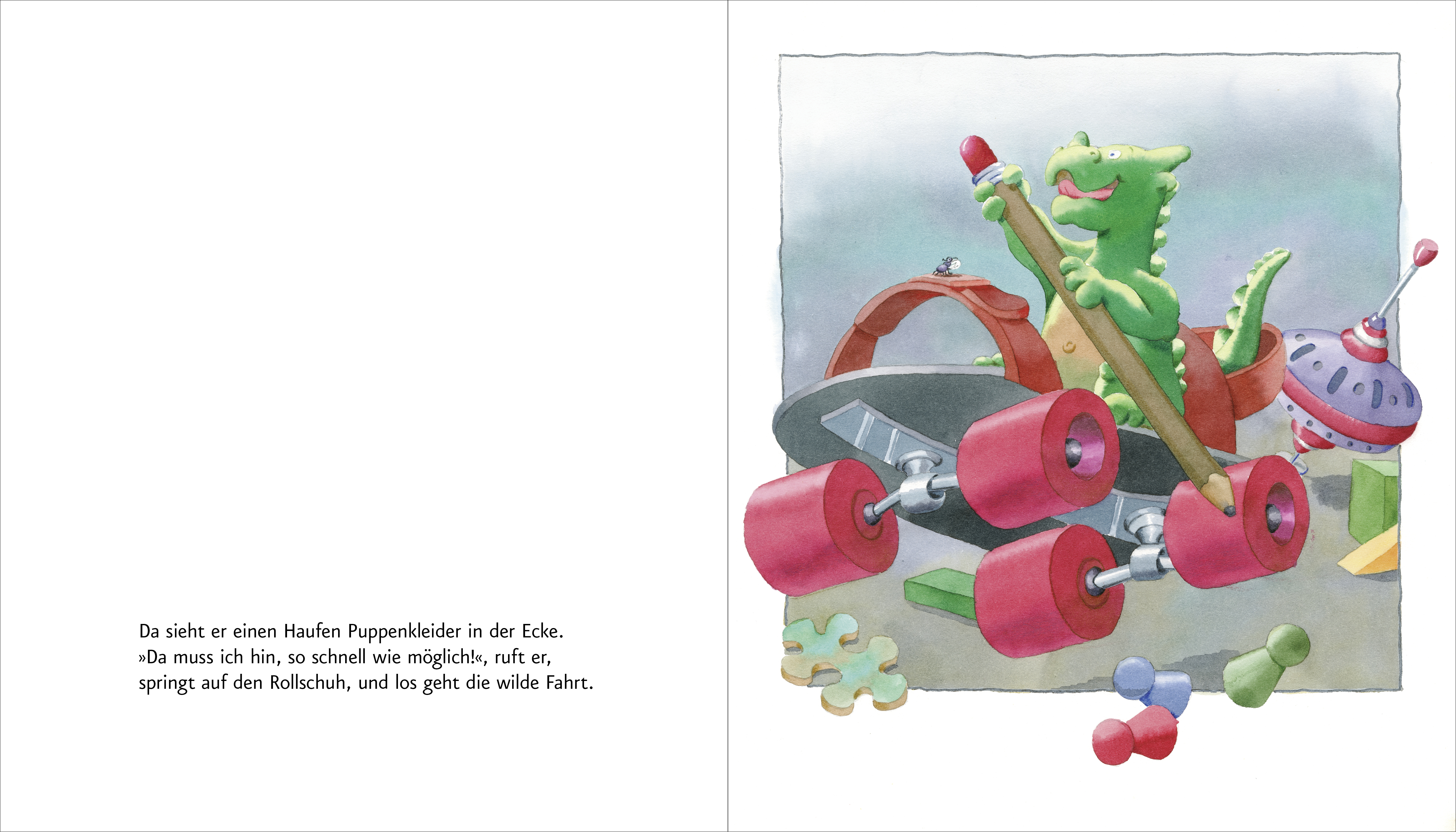 Während Anna schläft, wer bleibt da wach? Der kleine Drache Tobi! Er spaziert fröhlich durchs Zimmer, denn hier gibt es allerlei, was er gut gebrauchen kann. Am nächsten Morgen wundert Anna sich sehr: Wo ist ihr Strumpf und auch der Federball? Als sie ihr Lieblingsbuch mit dem kleinen grünen Drachen aufschlägt, da erlebt sie die größte Überraschung!