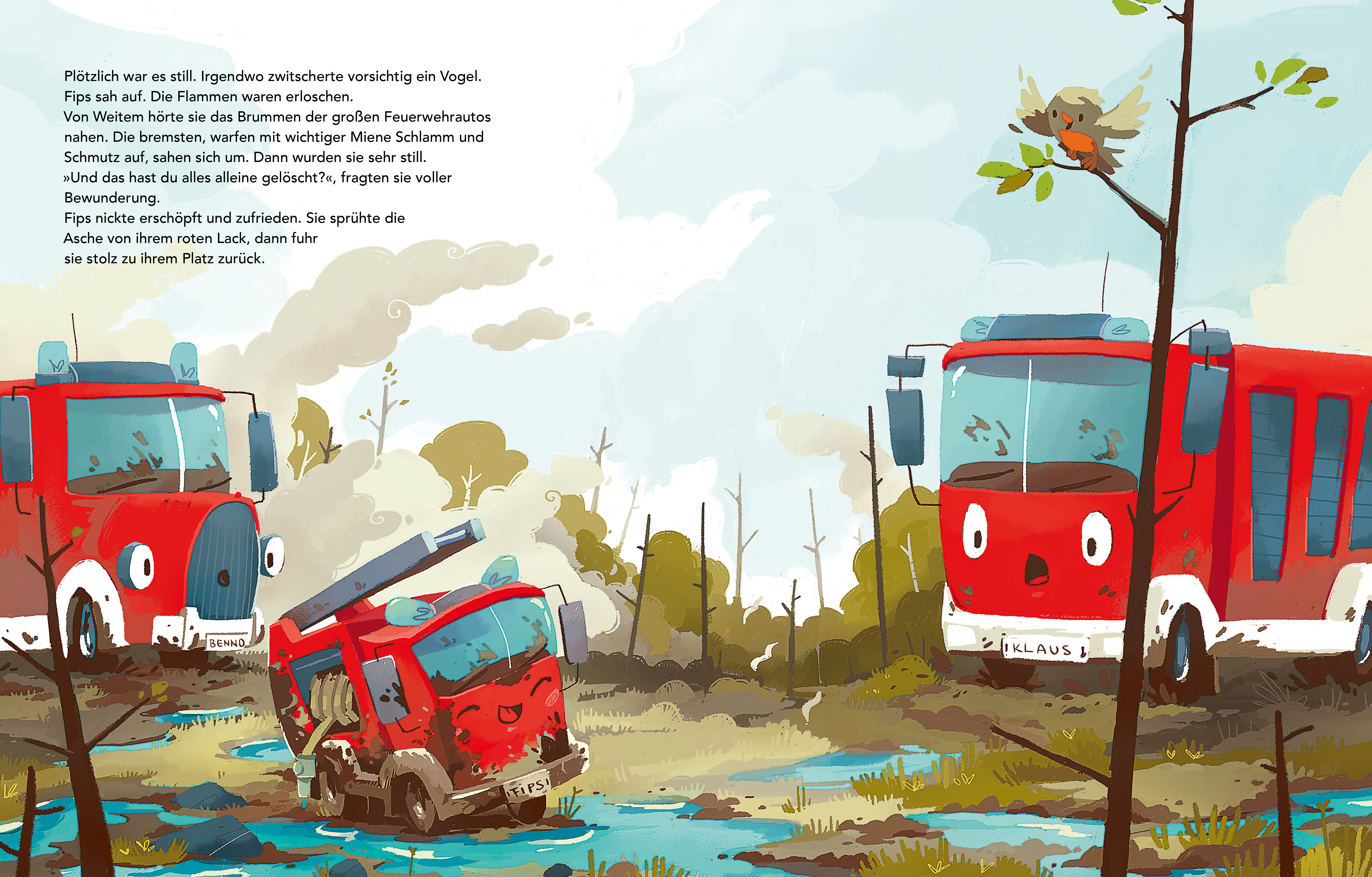 Mit heulender Sirene durch die Stadt düsen, tobende Feuer löschen und Menschen aus Gefahren retten - davon träumt jedes Feuerwehrauto! So auch das kleinste Feuerwehrauto, das jemals aus den Fabriktoren gerollt ist: Fips. Mutig macht sich sie sich an die Arbeit, auch wenn sie von den Großen meist belächelt wird. Denn sie ist sich sicher, dass sie bei ihren Einsätzen Großes bewirken kann. Als dann ein Waldbrand ausbricht und der schnellste Weg zum Brandherd über eine schmale klapprige Brücke führt, kann sie endlich allen beweisen, was in ihr steckt.