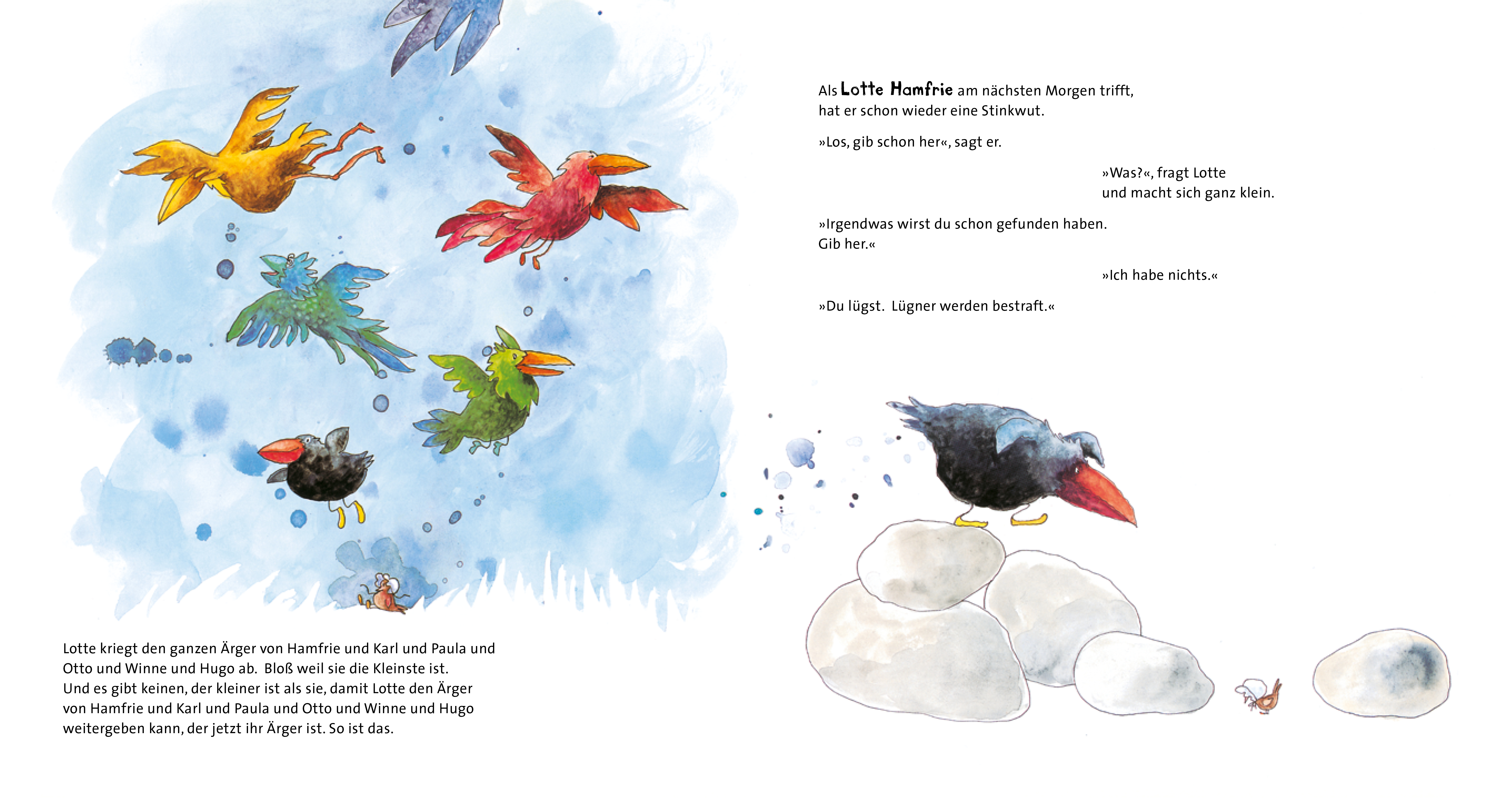 Der kleine Vogel Lotte wird ständig vom Raben Hamfrie gemobbt und gepiesackt. Er nimmt Lotte all ihre Lieblingsdinge weg und ist gemein zu ihr. Und Lotte soll bloß nicht petzen! Die Eule Olla aber ist für sie da und bietet ihr die Freundschaft an. Denn wenn man mit einer Freundin über seine Sorgen spricht, ist das keinesfalls Gepetze! Olla stärkt Lotte den Rücken, hält zu ihr und verleiht ihr so neues Selbstbewusstsein. So kann die kleine Lotte schließlich Hamfrie aufrecht gegenübertreten - und plötzlich wird der große Hamfrie ganz klein.