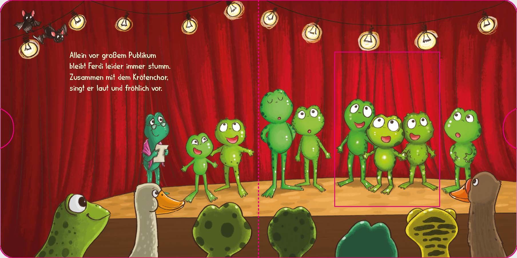 Ferdi, der kleine Frosch, traut sich nicht, ins Wasser zu hüpfen, fürchtet sich im Dunkeln und hat viel zu große Angst, allein vor anderen zu singen. Doch wenn seine Freundinnen und Freunde ihn an die Hand nehmen, hat Frosch Ferdi plötzlich jede Menge Mut und beweist, dass er alles kann!Ein Pappbilderbuch mit lustigen Reimen und Verwandelschiebern, die zeigen, wie man mutiger werden kann. Ideal für Kinder ab 24 Monaten.- Bietet Hilfe im Kinderalltag