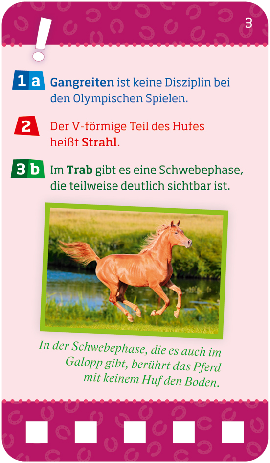| Schlagworte | Ernährung • Pferde • Pflege • Quiz • Rasse • Rätsel • Reiten • Turnier • Wissen |