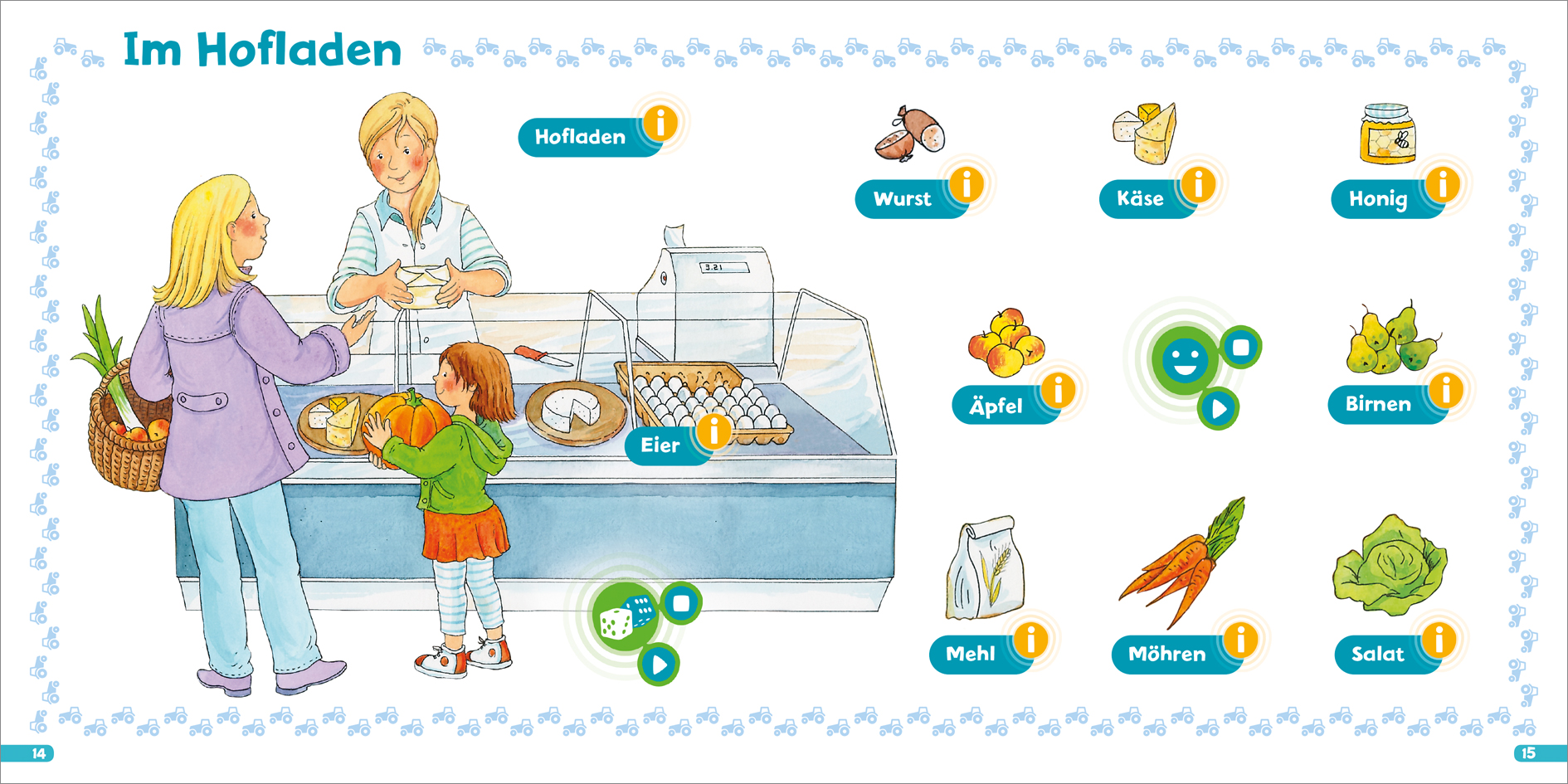 Fröhlich grunzende Schweine und ein laut tuckernder Traktor auf dem Feld: Auf dem Bauernhof gibt es viel zu entdecken. Typische Geräusche, die Stimmen der tierischen Bewohner sowie spannende Informationen rund um das Bauernhofleben erhalten Kinder, wenn sie die Bezeichnungen und farbenfrohen Bilder mit dem BOOKii-Hörstift antippen. Für Abwechslung und Spaß sorgen lustige Spiele sowie der mitreißende Boogie-Woogie. Das besondere Highlight des Buches ist eine Extra-Stelle, auf der sich die Kinder selbst aufnehmen und immer wieder anhören können. Dank seines handlichen Formats ist das Buch ein toller Begleiter während kleiner Wartezeiten.Der BOOKii® Hörstift ist nicht im Lieferumfang des Produkts enthalten. Er ist separat im Handel erhältlich.
