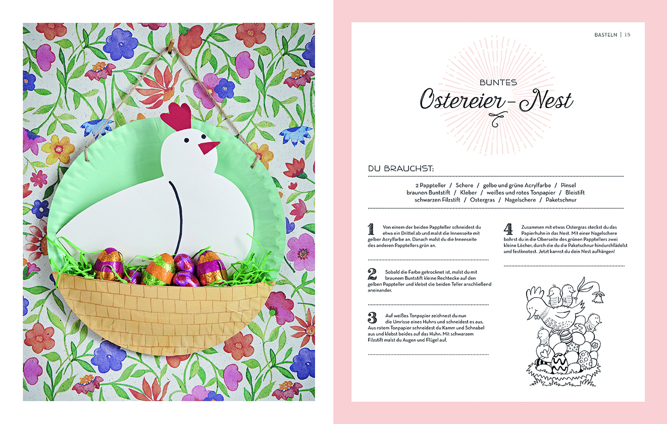 Wenn im Frühling die Natur erwacht, erstes Grün aus der Erde sprießt und die Vögel zwitschern, ist Ostern nicht mehr weit. Und da gibt es viel zu tun: Es müssen Eier gefärbt, kuschelige Häschen gebastelt und süße Lämmchen gebacken werden. Abwechslungsreiche Bastelideen mit illustrierten Schritt-für-Schritt-Anleitungen, kreative Rezepte und witzige Spiele verkürzen die Zeit – bis dann endlich der Osterhase da ist!