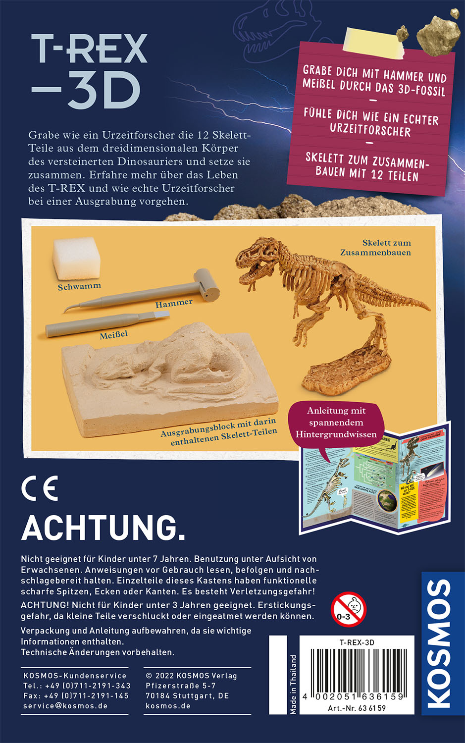 Hier liegt der T-Rex auf dem Gipsblock als wäre er lebensecht versteinert. Wer mutig genug ist, durch ihn hindurchzugraben, stößt auf seine Knochen! Mit dem beiliegenden Werkzeug aus Hammer und Meißel werden alle Knochen gesucht und sorgfältig freigelegt - eine paläontologische Ausgrabungsstätte für Zuhause. Die ausgegrabenen Knochen werden zu einem vollständigen T-Rex-Skelett zusammengebaut, das realistisch und beeindruckend zugleich das Kinderzimmer bewacht. Wann lebten die Dinosaurier? Und wie sah ihre Welt aus? Die Anleitung erklärt ausführlich den Körperbau des T-Rex und liefert tolle Hintergrundinfos zur Urzeit. Dieses KOSMOS Ausgrabungs-Set begeistert Kinder zwischen 7 und 9 Jahren mit einem realistisch aussehenden 3D-T-Rex und spannendem Grabungsspaß! Ein tolles Geschenk für Zwischendurch. Auf ins Ausgrabungs-Abenteuer! Im Gestein verstreut liegen die Knochen eines Tyrannosauraus, die vorsichtig mit Hammer und Meißel freigelegt werden müssen. Echte Urzeit-Atmosphäre schafft die Gestaltung des Gips-Blocks, der die Form eines versteinerten 3D-T-Rex zeigt, als wäre er gerade erst gestorben! Sind die Knochen dieses Urzeit-Giganten erst einmal ausgegraben, bauen die Kinder zwischen 7 und 9 Jahren das Skelett zusammen und stellen es als tolle Deko in ihrem Zimmer auf. Wer genau hinsieht kann neben dem Skelett sogar das Modell eines Menschen erkennen, zum Größenvergleich! Mit dem KOSMOS Ausgrabungs-Set erleben Kinder Dinosaurier im eigenen Kinderzimmer!