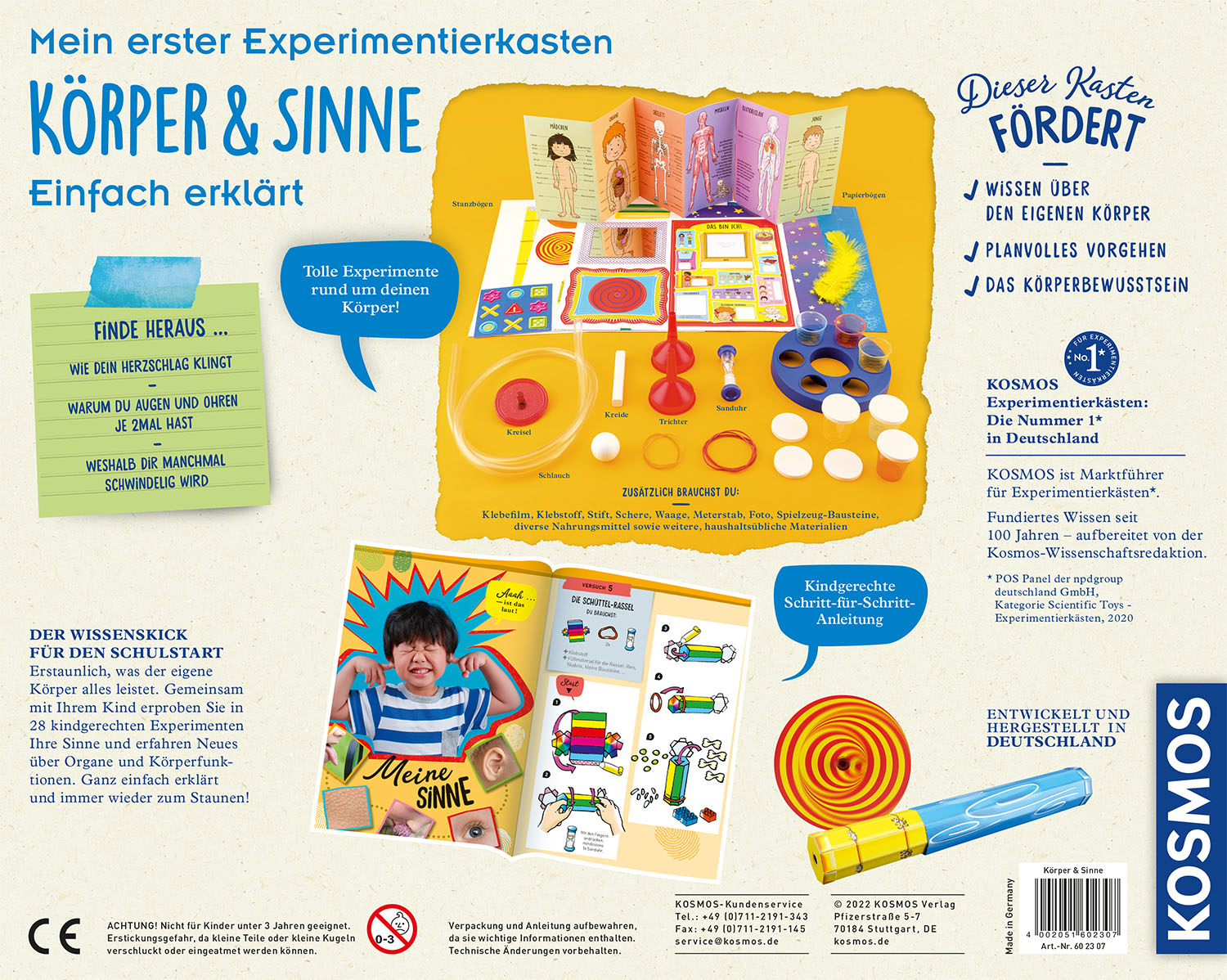 Forschen mit vollem Körpereinsatz! Mit dem KOSMOS Experimentierkasten werden alle Sinne ausführlich getestet und Kinder zwischen 5 und 8 Jahren lernen ihren eigenen Körper kennen. Wie halte ich das Gleichgewicht? Was können meine Fingerspitzen ertasten, und warum blubbert es in meinem Bauch? In einfachen Versuchen entwickeln die Kinder ein tieferes Verständnis für ihren Körper. Kleine Vorführungen der Versuche, die teilweise auch so manchen Erwachsenen verblüffen werden, stärken spielerisch das Selbstbewusstsein der Kinder. Die kindgerechte Anleitung zeigt alle Arbeitsschritte in übersichtlichen Bildern und unterstützt erstes Forschen auch ohne Lesekenntnisse - genau das Richtige für Vorschulkinder und Schulanfänger. Ob als Wissens-Kick vor dem Schulstart oder um schon im Kindergarten den Forschergeist zu wecken, nichts ist so spannend wie der eigene Körper! Für Kinder ist jeder Tag eine neue Entdeckungsreise! Hier werden sie selbst zum Forschungsgegenstand. Wie halte ich das Gleichgewicht? Was ist das für ein Blubbern in meinem Bauch? Wie schnell pocht mein Herz? Das selbst gebaute Stethoskop verrät Erstaunliches über das eigene Innere, und mit Zauberfernrohr und den optischen Täuschungen wird gleich weiter gestaunt!In vielen abwechslungsreichen Versuchen lernen Vorschulkinder und Schulanfänger ihren Körper und ihre Sinne besser kennen und werden dabei zur Interaktion und Bewegung angeregt. Die kindgerechte Anleitung erklärt die Versuche Schritt für Schritt in übersichtlichen Bildern. So sind Forscherspaß und Erfolgserlebnisse im KOSMOS Experimentierkasten für Kinder von 5 bis 8 Jahren auch ohne Lesekenntnisse garantiert!