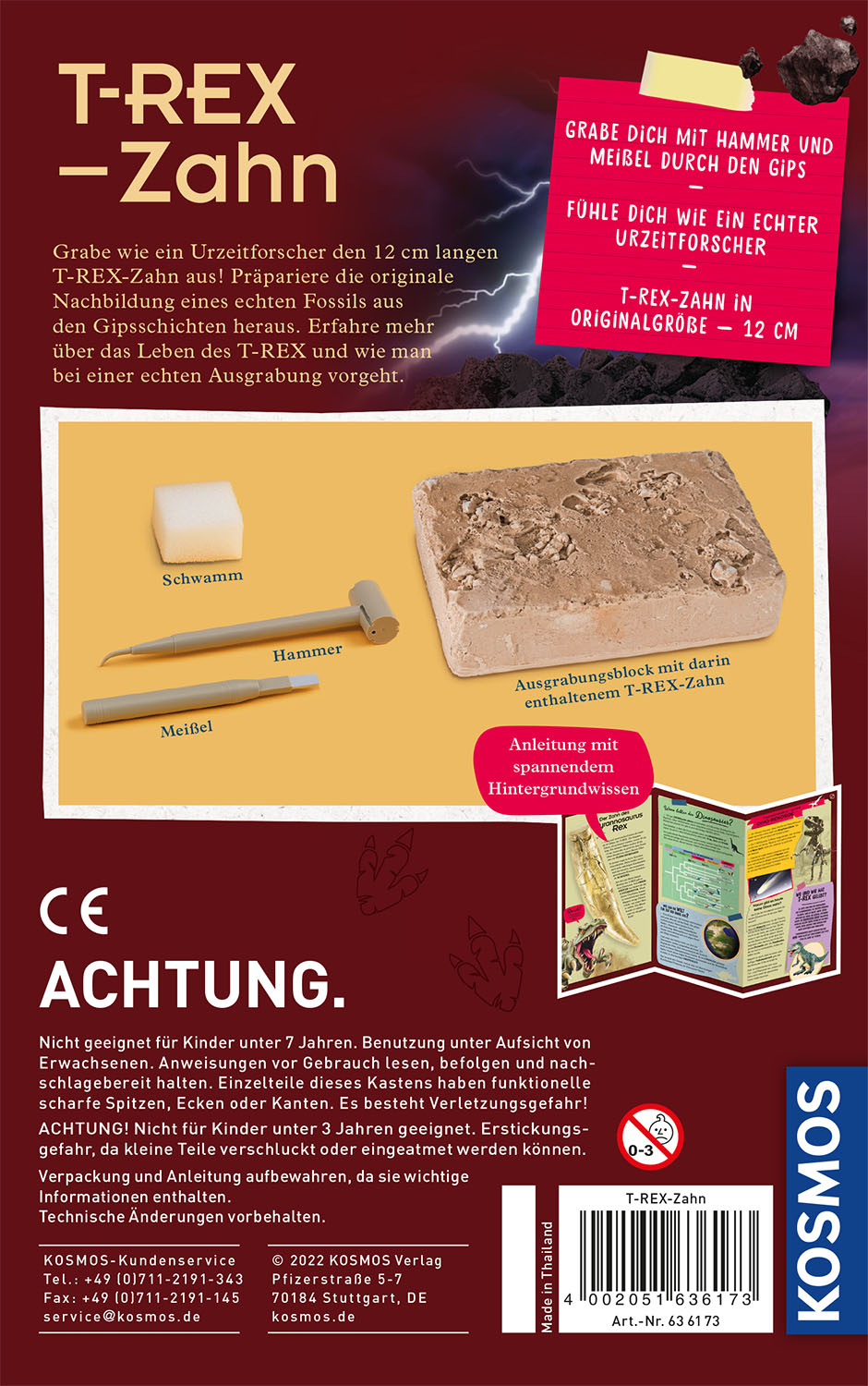 In diesem Gipsblock steckt ein T-Rex Zahn in Originalgröße! Die täuschend echt aussehende Nachbildung des Fossils begeistert jeden Urzeit-Fan. Mit Hammer und Meißel wird der Zahn aus dem Gipsblock ausgegraben. Dabei gehen die kleinen ForscherInnen wie in einer echten archäologischen Ausgrabungsstätte vor. Als einzigartiges Fundstück ist der T-Rex Zahn der Hingucker im Kinderzimmer und kann wie in einem Museum ausgestellt werden. Wie entsteht ein Fossil? Und woher weiß man, wie alt es ist? Viele Fragen rund um die Urzeit werden in der bebilderten Anleitung geklärt. Das KOSMOS Ausgrabungs-Set lässt Kinder zwischen 7 und 9 Jahren ihren T-Rex Zahn in Originalgröße selbst entdecken - ein Fund der begeistert und auf den man wirklich stolz sein kann! Ein T-Rex Zahn in Originalgröße! Aber wo steckt er? Bevor die täuschend echt aussehende Nachbildung des Zahns bestaunt werden kann, graben Kinder zwischen 7 und 9 Jahren ihn zuerst aus dem Gipsblock aus. Dazu liegen Hammer und Meißel schon bereit! Wie in einer archäologischen Ausgrabungsstätte wird der Zahn Stück für Stück vorsichtig freilegt - dabei ist eine ruhige Hand gefragt. Die Anleitung des KOSMOS Experimentiersets erklärt, welche Grabe-Technik am besten funktioniert und hält spannende Hintergrundinfos rund um Dinosaurier bereit! Wie entstehen Fossilien? Wann lebten die Dinosaurier in der Urzeit? Und als Fundstück vom berühmtesten aller Urzeit-Giganten ist er ein ganz besonderer Hingucker im Kinderzimmer.