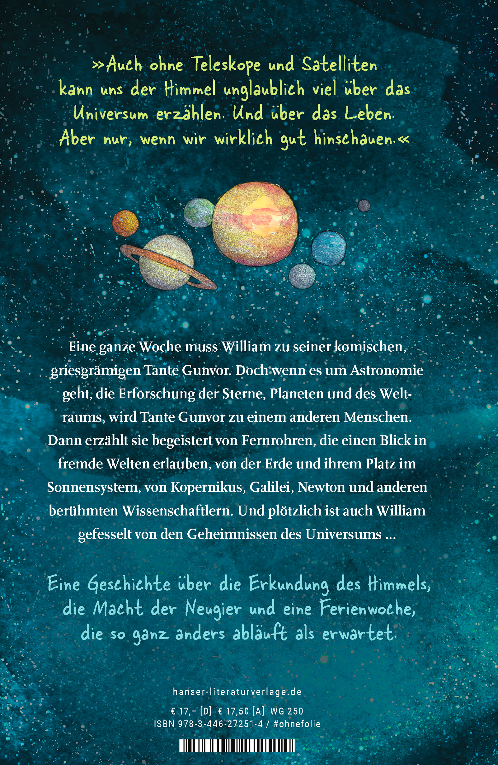 Wer hätte gedacht, dass Astronomie so spannend sein kann? Eine ganze Woche muss William zu seiner griesgrämigen Tante Gunvor, die absolut keine Ahnung von Kindern hat. Das werden bestimmt die schlimmsten Ferien aller Zeiten! Doch dann entdeckt er eine Schachtel mit geheimnisvollen Glaslinsen, und Tante Gunvor beginnt zu erzählen: von Fernrohren, die einen Blick in fremde Welten erlauben, von der Erde und ihrem Platz im Universum, von Kopernikus, Galilei, Newton und anderen berühmten Wissenschaftlern und ihren Entdeckungen. Williams Neugier ist geweckt, und jeden Tag erfahren er und die Leserinnen und Leser mehr erstaunliche Dinge über die Erforschung des Himmels. Ein Einblick in die Welt der Wissenschaft, der nicht nur Kinder begeistern wird.