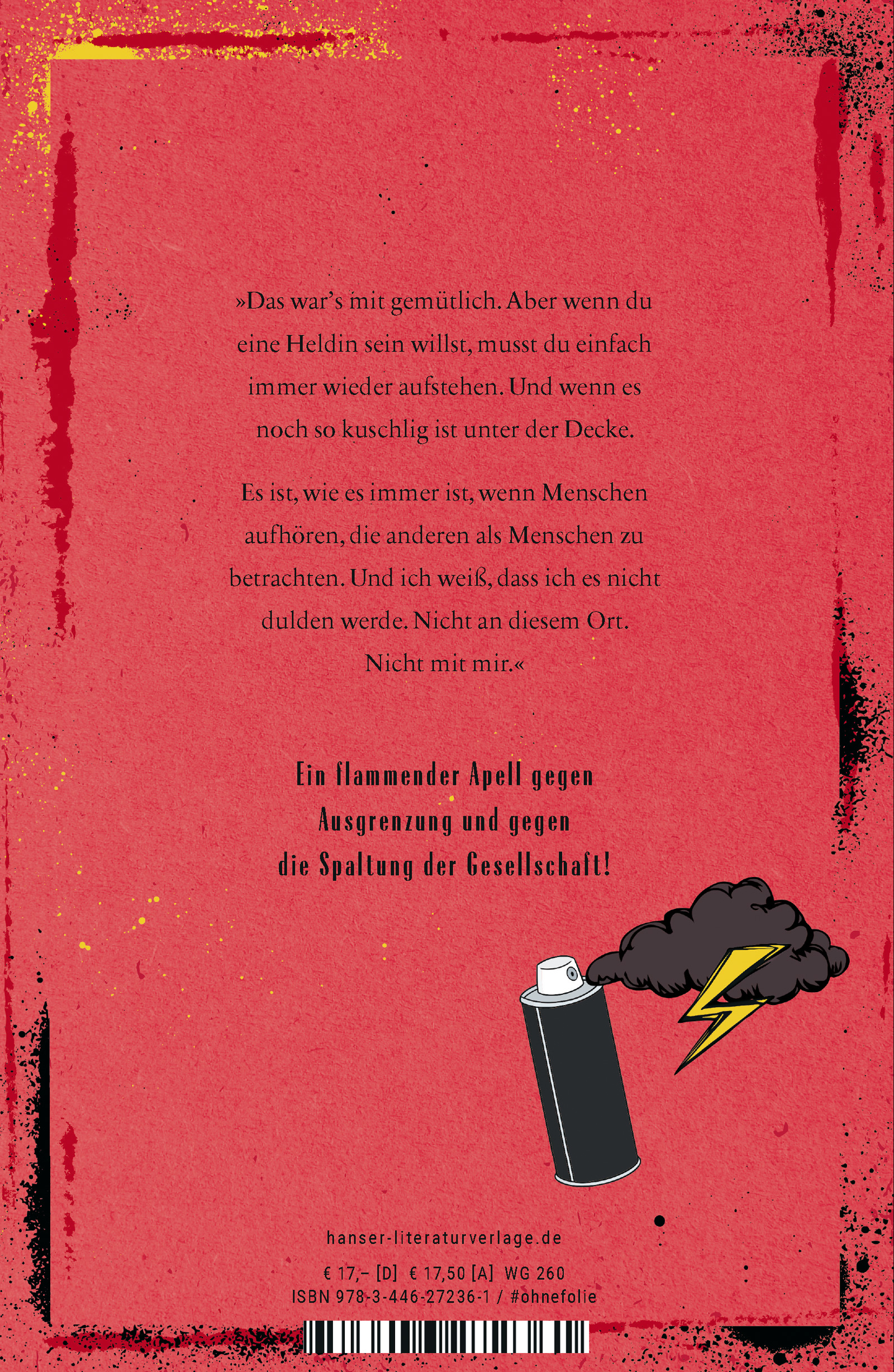 Madina hat den Krieg und seine Schrecken, die gefährliche Flucht hinter sich gelassen. Endlich hat sie das Gefühl, angekommen zu sein, wohnt mit ihrer Familie bei ihrer besten Freundin Laura, trägt keine schlecht sitzenden Kleider aus der Spendenkiste mehr und gehört in der Schule ganz selbstverständlich dazu. Aber dann kippt die Stimmung. Rassistische Schmierereien tauchen auf, und jeden Donnerstag skandiert eine Gruppe auf dem Hauptplatz: "Ausländer raus!", erst wenige, dann immer mehr. Eine Zerreißprobe, nicht nur für Madina, sondern für alle, die in dem Ort leben. Doch Madina beschließt, nicht wegzuschauen – und sie findet Verbündete.